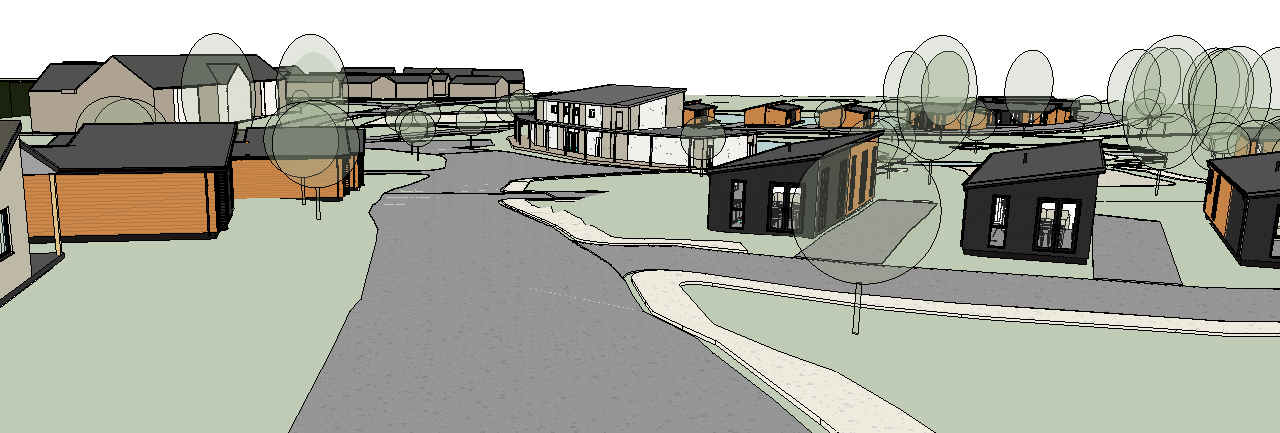 render a modern holiday park with black and timber clad lodges should be set in spring in the british countryside with native planting and light foliage there should be a red brick housing estate in the background and a red brick care home
