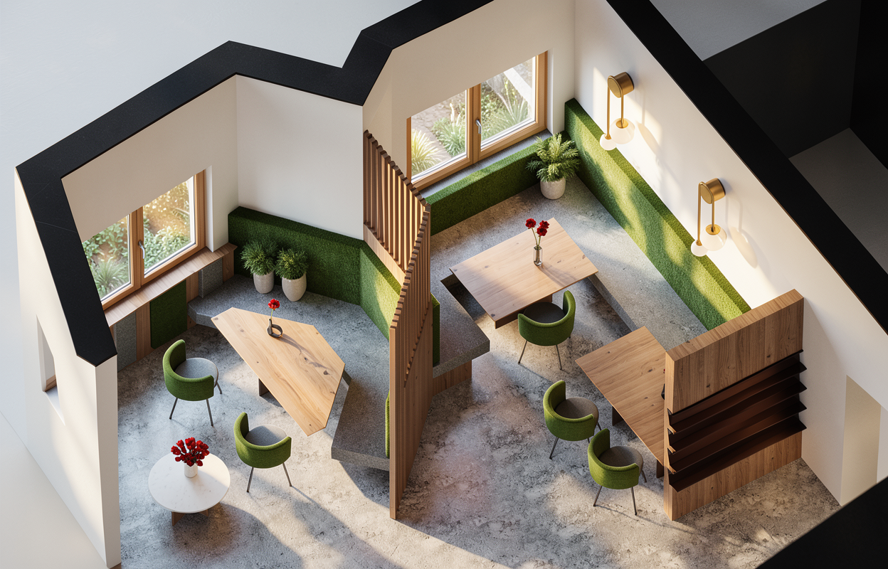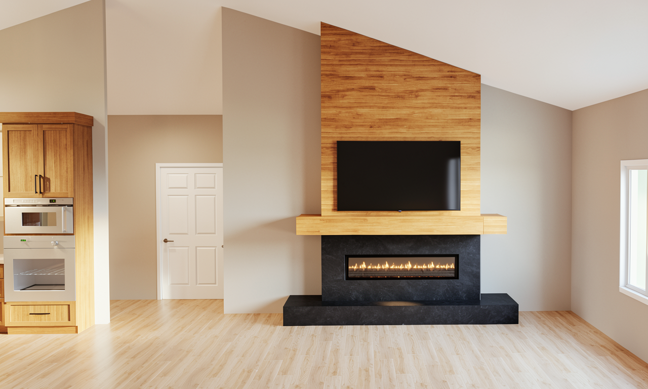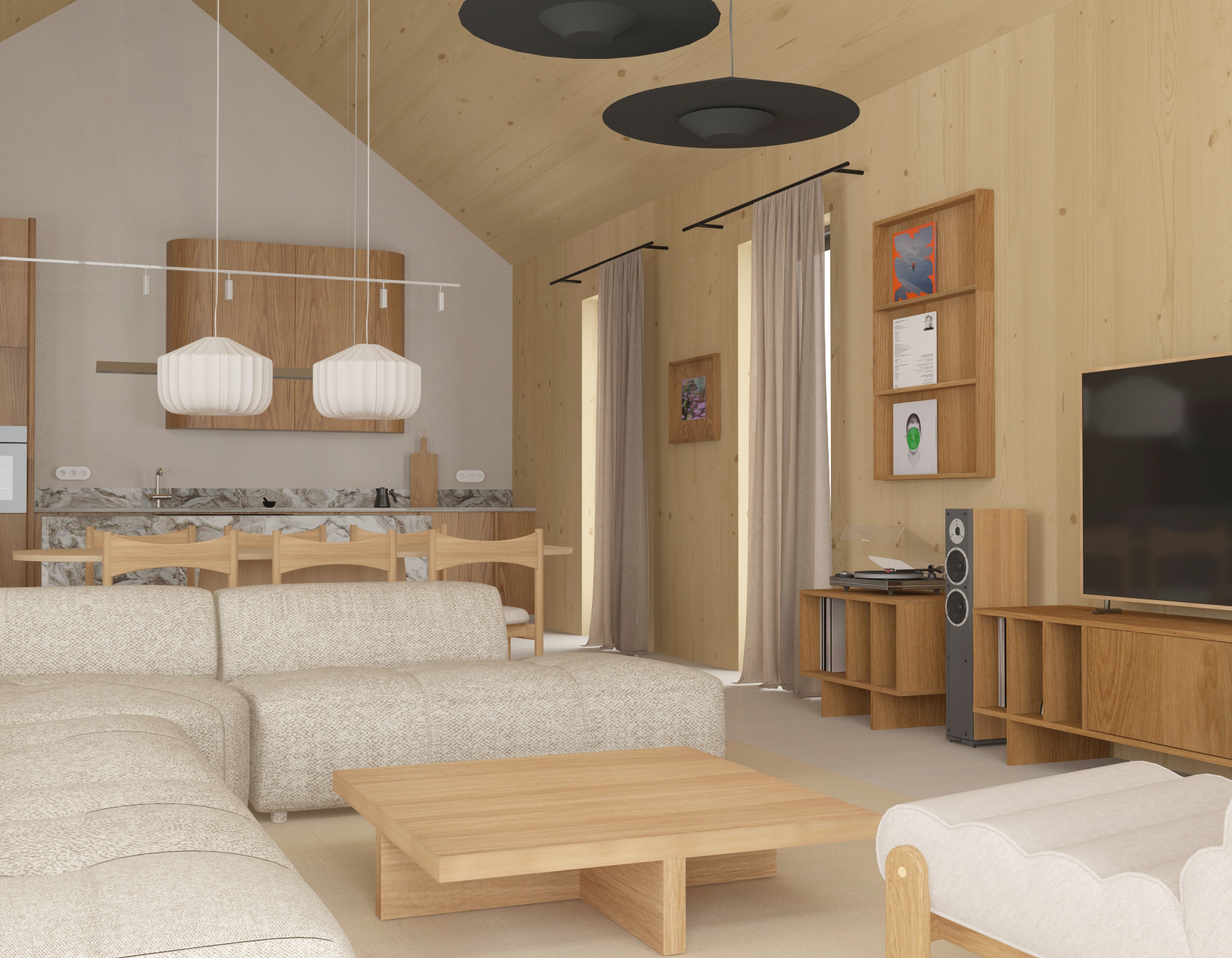 architectural photography ultra realistic 8k resolution cinematic lighting maintain original geometry kitchen wood strictly preserve and enhance the rich saturated wood color from the base image keep the wood tone deep warm and high contrast walls smooth knot free clt panels in a warm honey toned natural wood clearly darker than the floor floor and far wall seamless beige microcement curtains translucent white linen soft light diffusion lighting soft morning sunlight streaming from the right side kitchen island semi matte natural stone dining table matte knot free oak wood pendant lamps minimalist white fabric texture highly detailed textures realistic grain soft shadows chair seating fabric is plain light beige black lamps above sofa seating are made from black semi matt material wooden walls are made of pine wood i light color floor and one wall is made of concrete coffee table is made od light oak wood sun entering the room from the big window behind the camera position