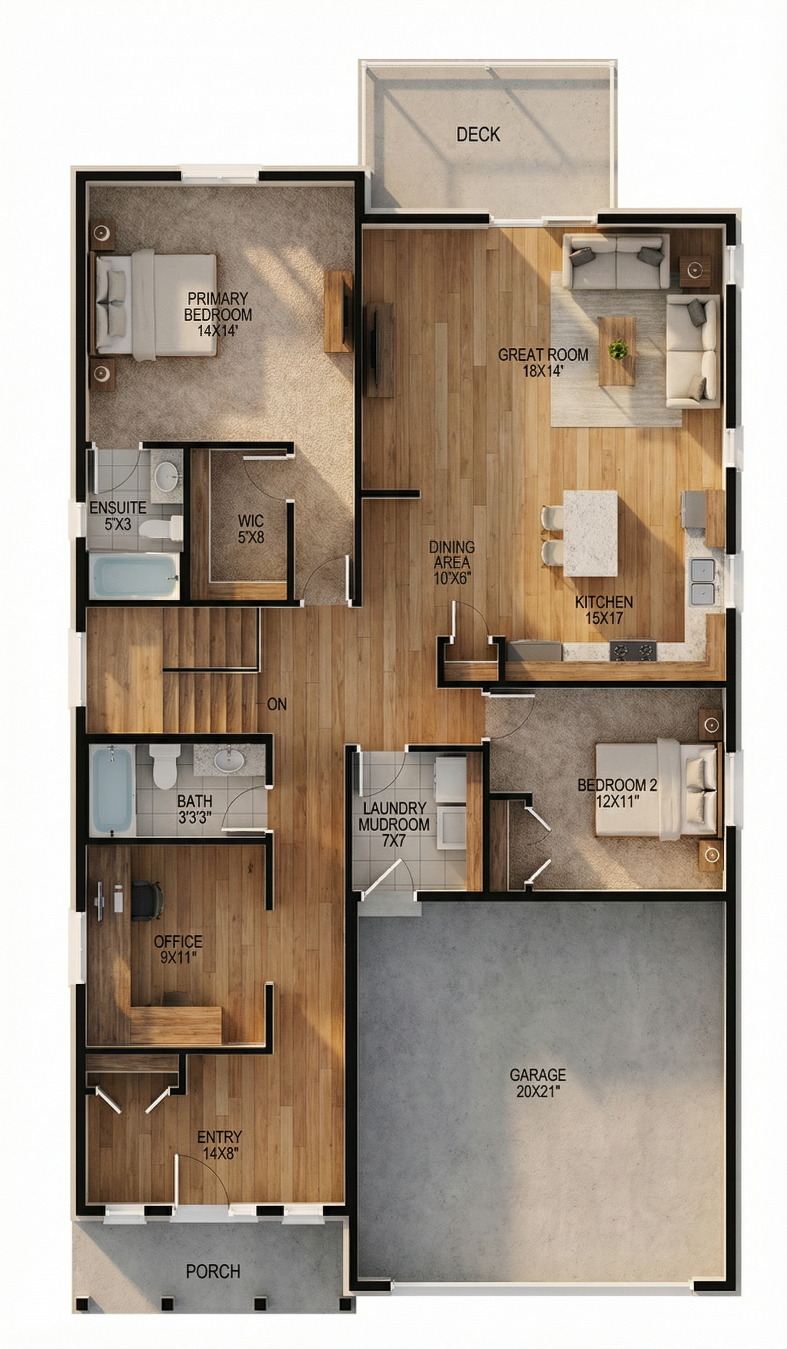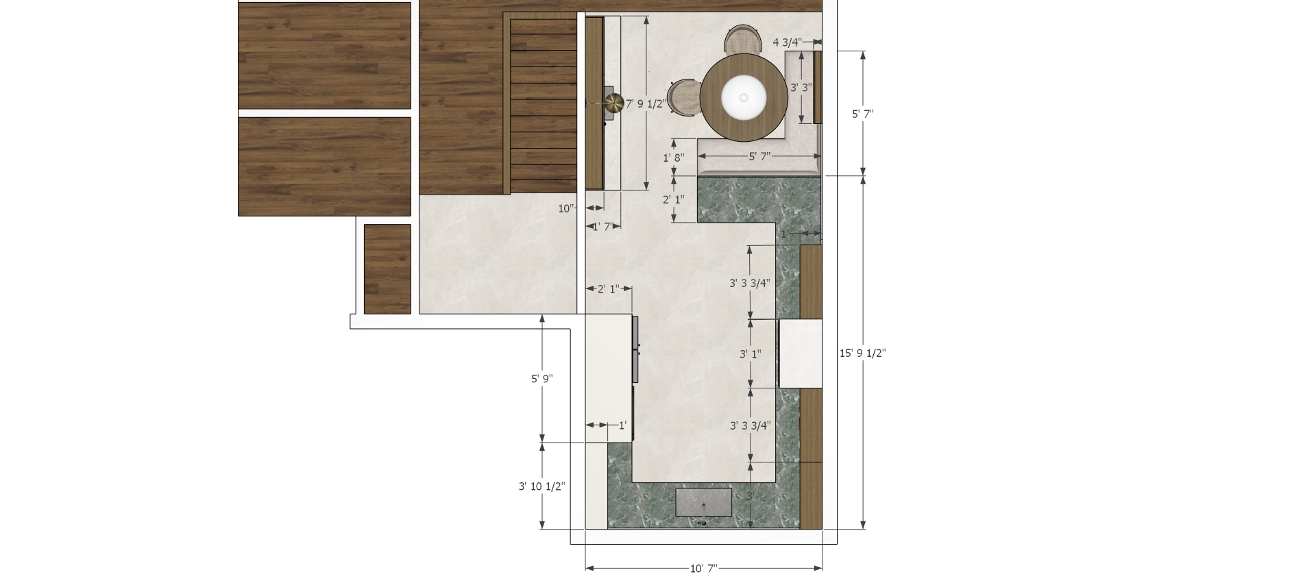 render this japandi kitchen floor plan do not change the design dimension and materials in the model add some lights and make the finishes realistic