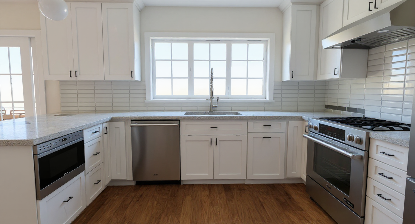 warm lighting wood floors marble tile backsplash natural daylight warm lighting from pendant and undercabinet lighting white upper cabinets and range hood wood base cabinets