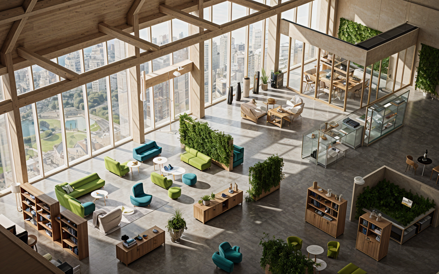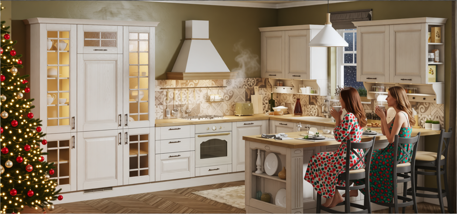 man and one kid are staying on the kitchen and look outside of the window they smile outside is raining snow there is christmas tree with lights in the room the women is with home dress in pastel colors without shoose and dring tea she is relaxed and dring hot tea slowly it is night there is light from the kitchen glass cupboards