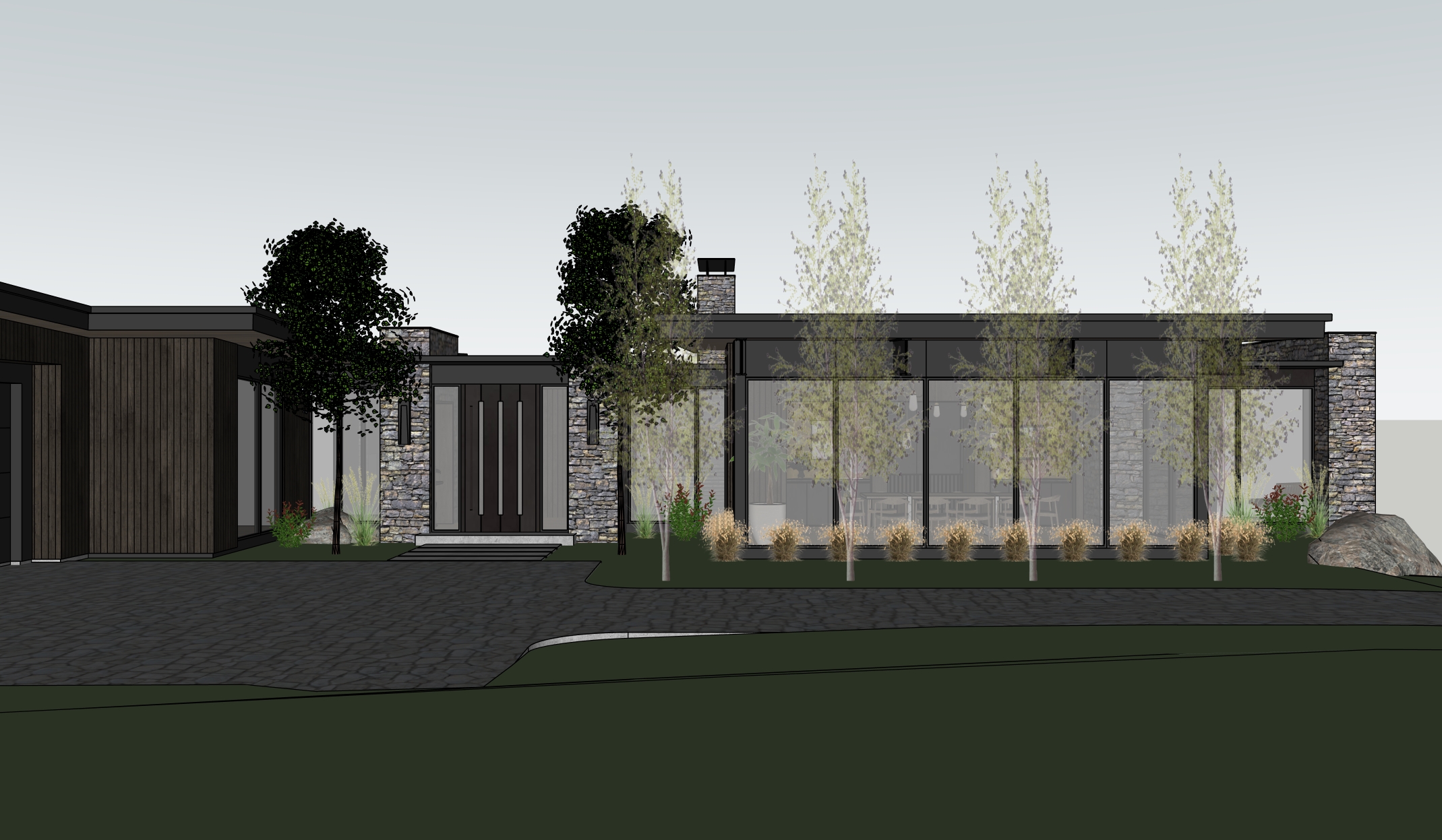 home located in the blue ridge mountains near asheville north carolina rough hewn tennessee fieldstone and stained vertical shiplap siding dark metal accents and window frames plate steel chimney coping to match window frame color home located in north carolina hardwood forest with dense trees beside home no trees behind house grasses and sparse native plants in foreground no lawn morning light with light fog in trees behind replace flagstones with pavers in driveway