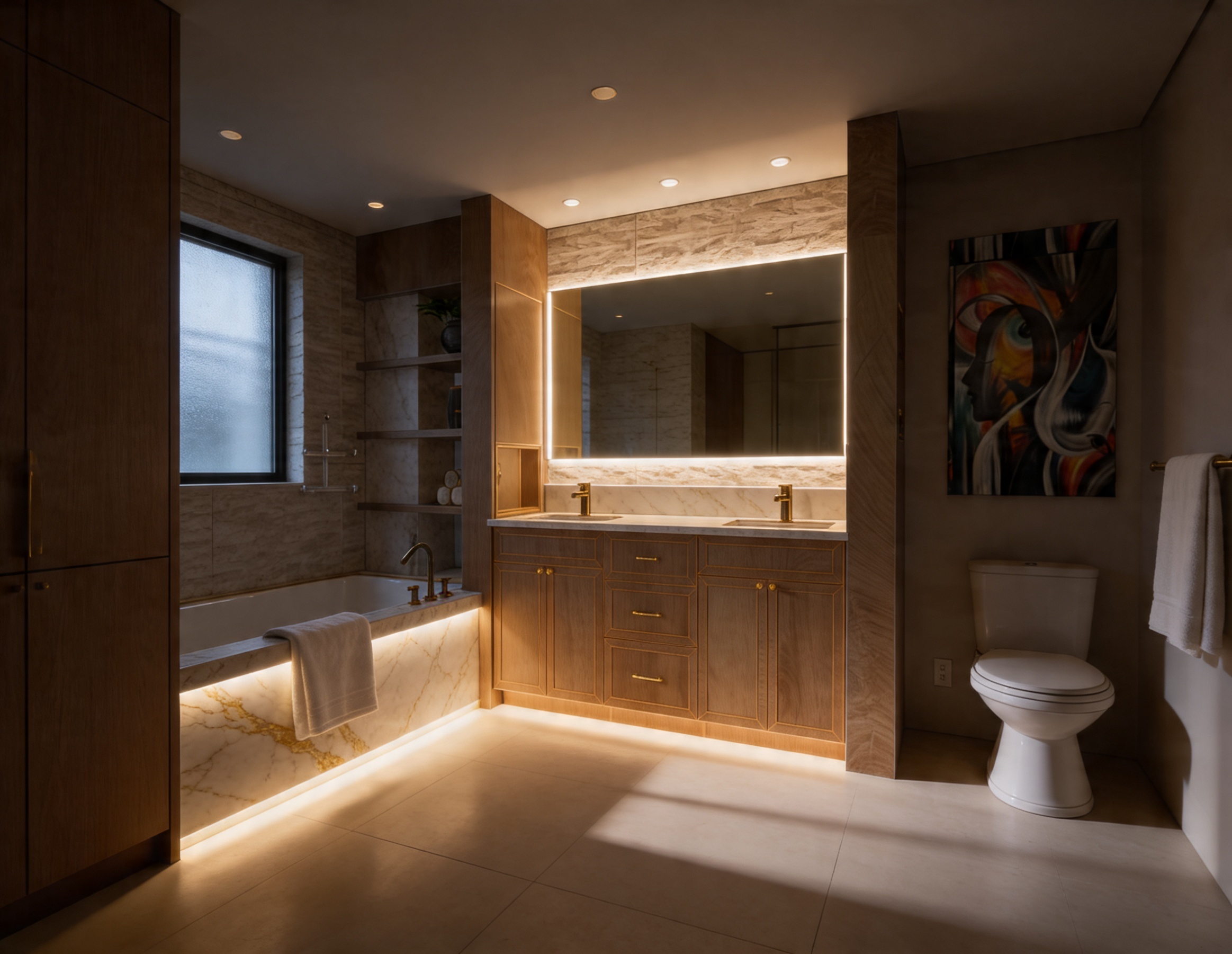 replace island cabinets with modern slab cabinets add rug under dining table make trees and shrubs look realistic show a child jumping in the pool show adult sitting in lounge chair