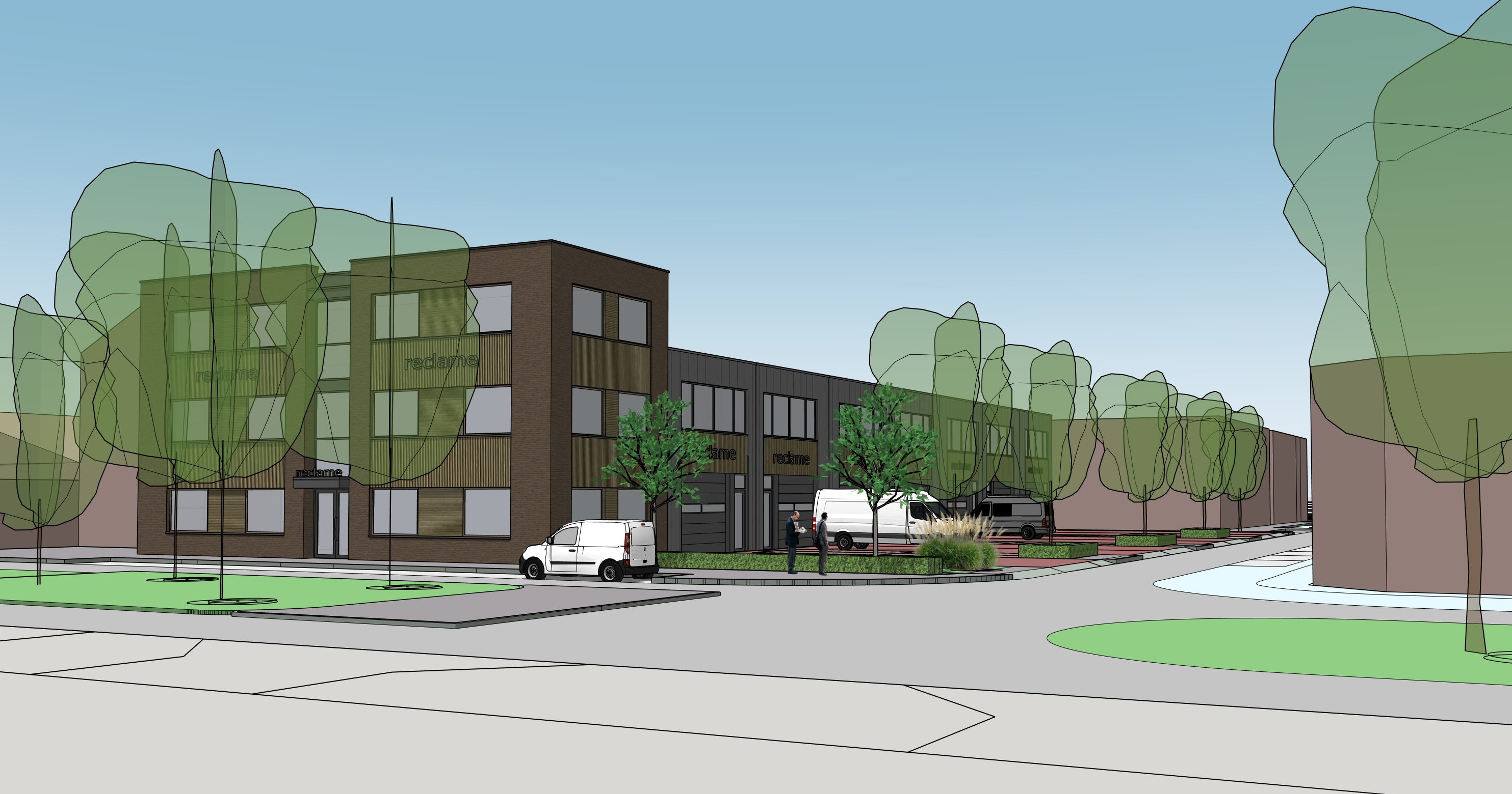 the weather is sunny with a few clouds in the sky add some people and cars around the building behind the glass of the building there are some offices visible keep the materials of the building the same as in the original