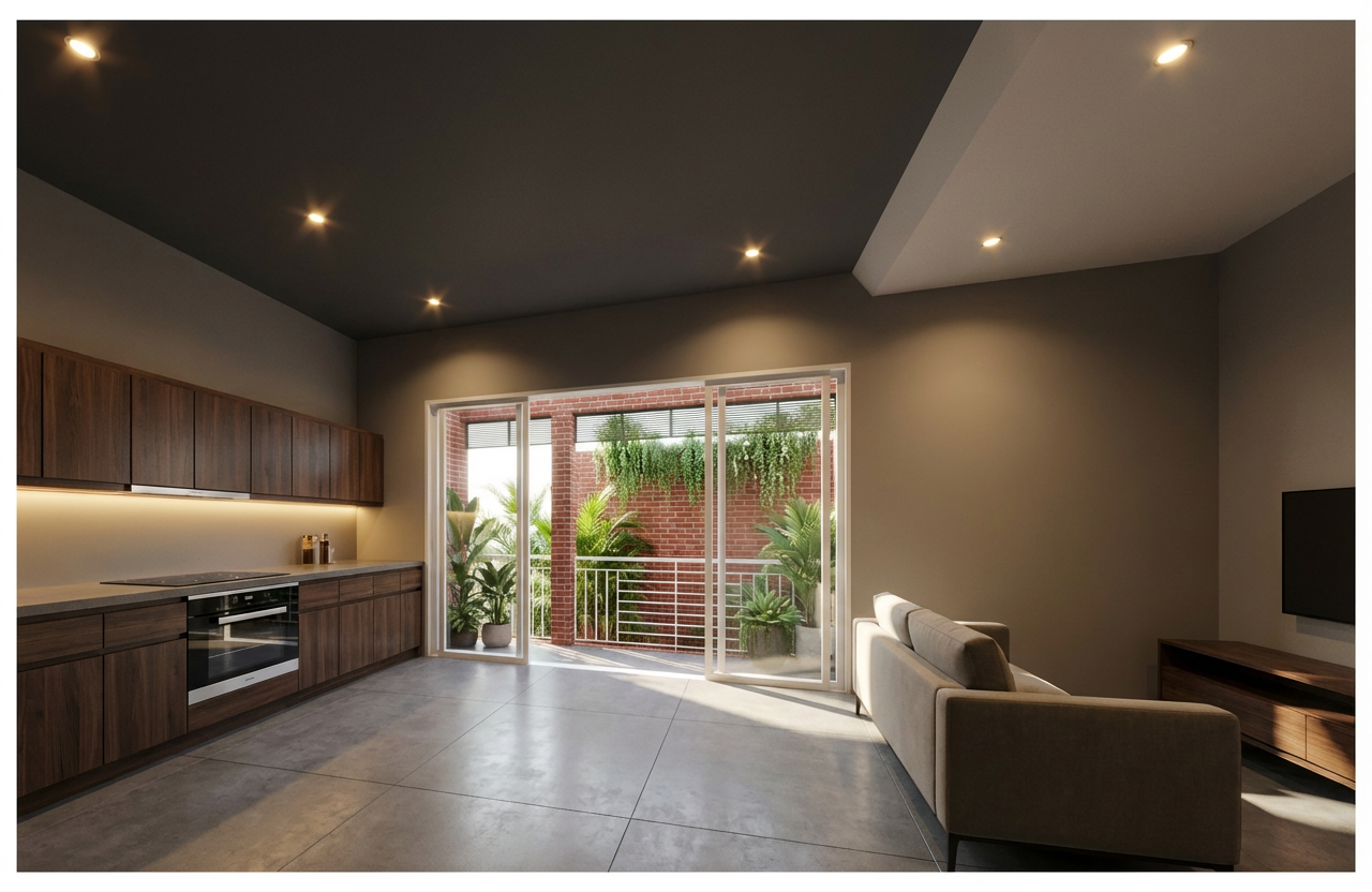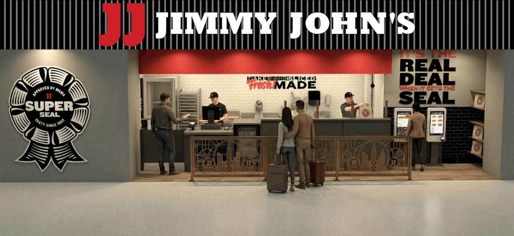 this is a proposed jimmy john s to be located in an airport transform the provided restaurant interior image into a high end photorealistic render with warm lit atmosphere and relaxed upscale energy while keeping everything exactly the same same proportions same equipment same ceiling curves same wall finishes same materials while making them look realistic and same spatial configuration please make the bulkhead look realistic the gray is an underlay is should be the furthest back out of everything in the image it is a paint to make the black wood panels sitting on top of it pop the black color resembles wood panels spaced evenly that sits on top of the gray backdrop these wood panels are what the sign is fastened to the sign should pop out a little bit since they are 3d letters the jimmy john s sign can be lit however do not make it too bright so it does not distract your eyes from the rest of the image the bulkhead is also very slightly rounded if you can take this into account reference the attached render for the slight curve the rest of the image follows and the lighting that we have proposed so we can add the bulkhead above the attached render to make one seamless image do all of this while keeping the camera angle existing materials signage and other composition exactly the same do not change anything just make the image look seamless and realistic with a high quality