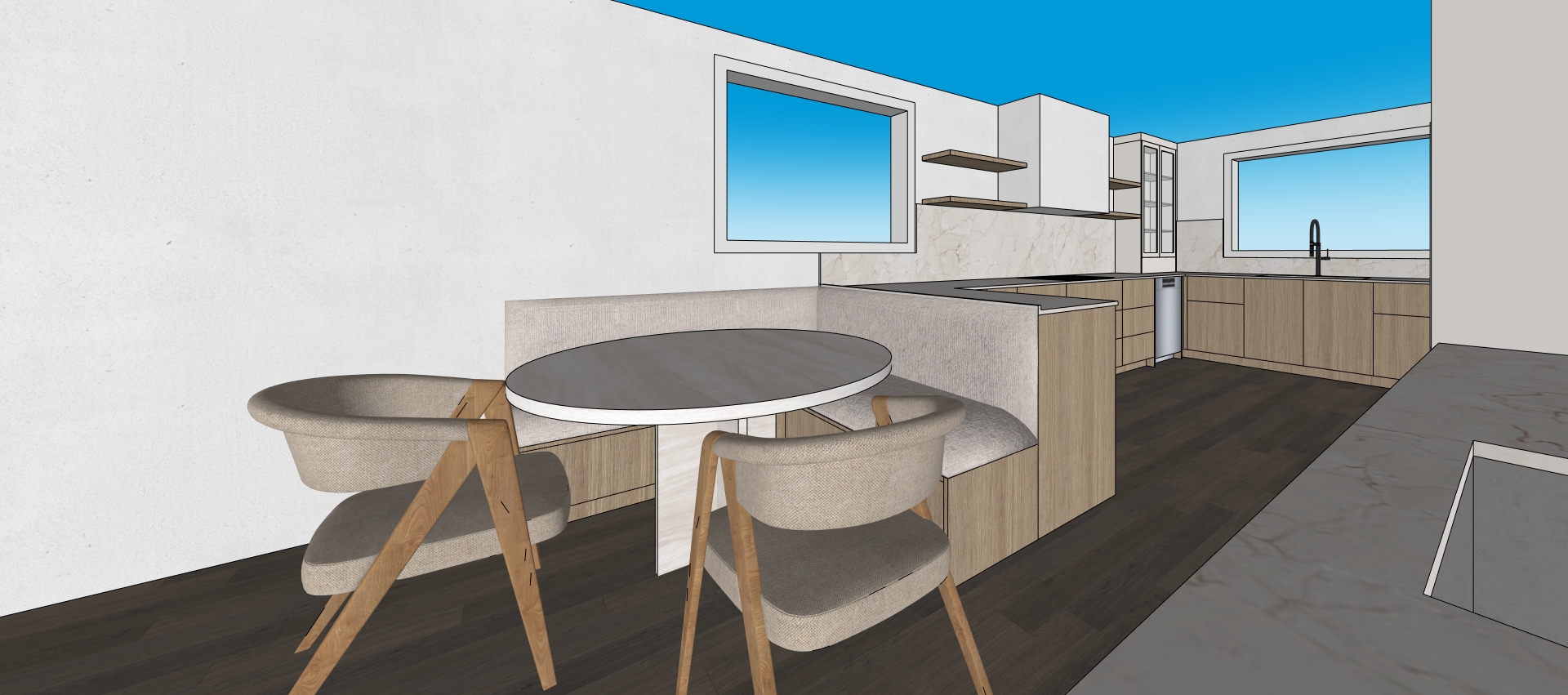 render this japandi style kitchen by adding realistic materials lighting and decorations maintain the structure layout dimension and design of this kitchen this kitchen has the main kitchen area and dining banquet seating area walls and insert hood are off white plaster floating shelves and base cabinets are natural oak matte sit on counter cabinet is off white painted mdf with sheen level 50 with frosted glass add shelf lightings and glass cabinet lightings ceiling will have modern white track lightings add modern roman shade in the window in natural linen add minimal decorations like stacked plates planter cook book in japandi style add a large white round pendant made of rice paper over the dining table add vase on the dining table