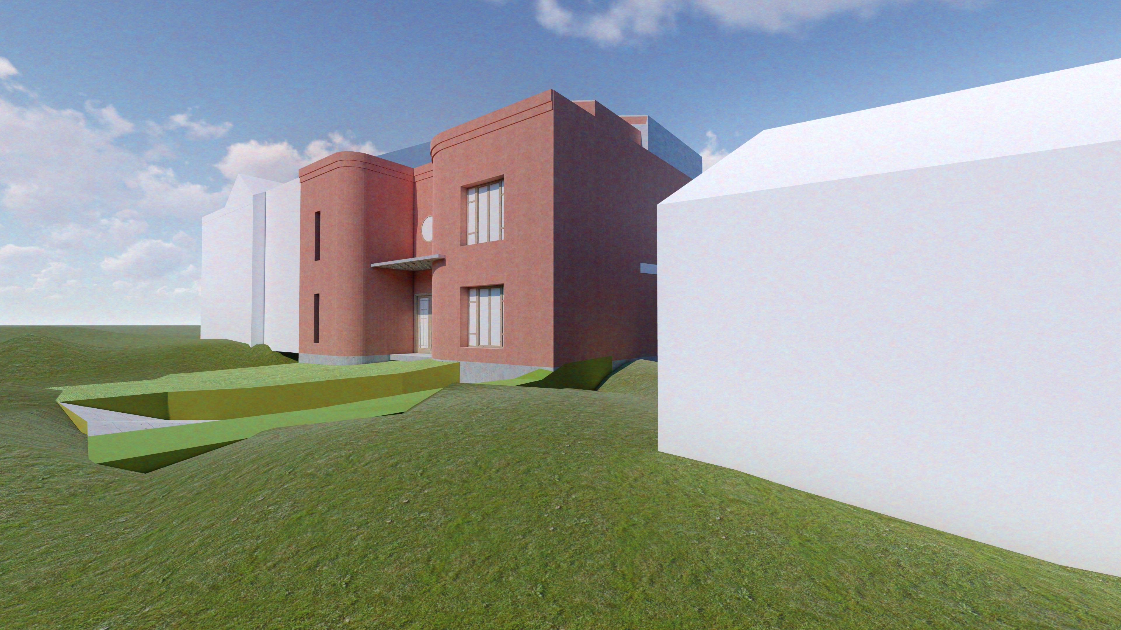 integrate the provided 3d building render into the reference environment image use the screenshot as context ensure realistic placement perspective alignment lighting consistency and shadows matching the surroundings modify the building fa ades to a smooth beige plaster finish matte slightly textured natural tone change all window frames to ral 7012 basalt grey with a clean modern finish maintain architectural realism high quality materials and consistent lighting preserve the original design while enhancing integration into the environment add subtle weathering realistic reflections in the windows and natural light interaction ensure the project blends seamlessly into the site with convincing depth shadows and color harmony