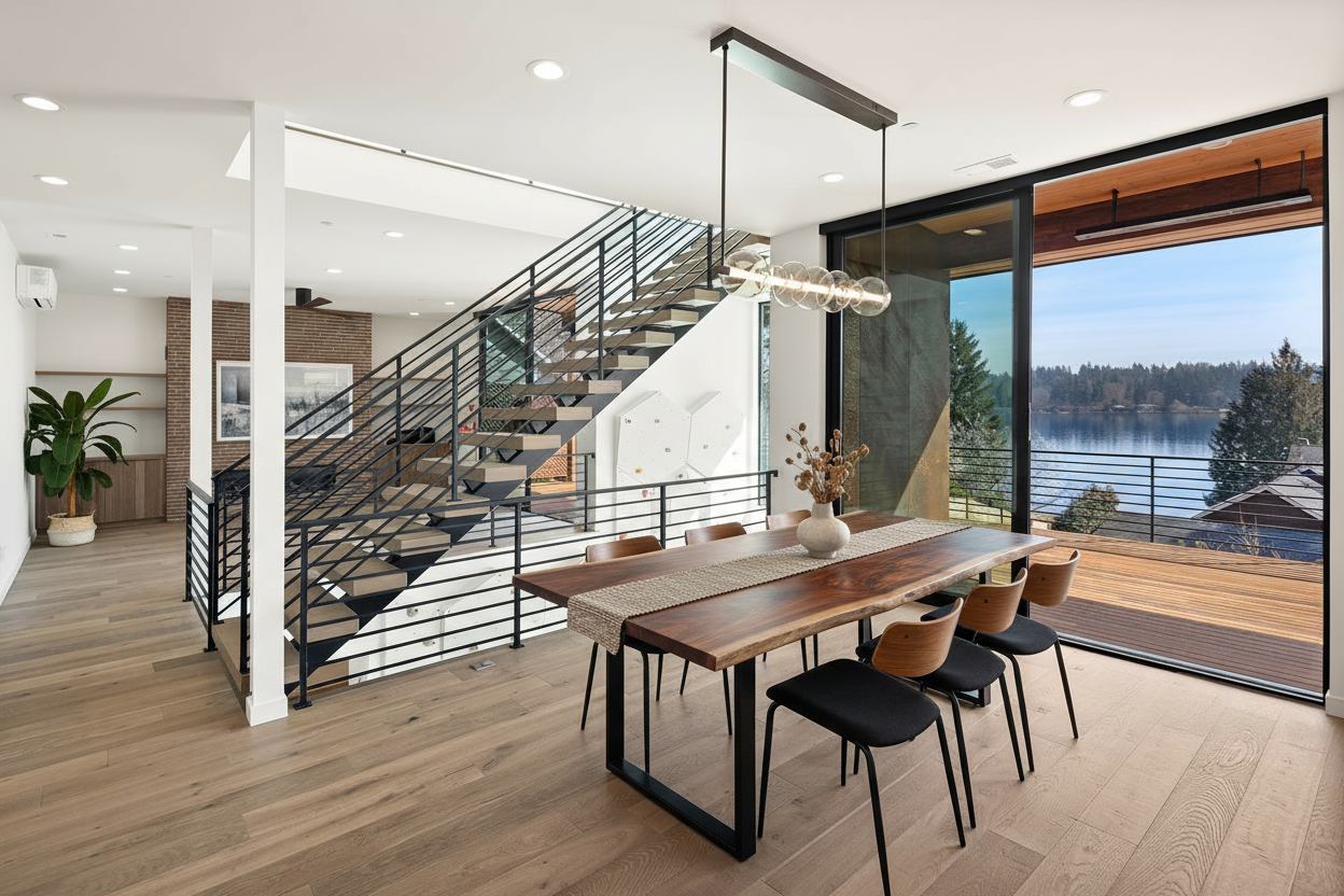 add clean elegant dining room furniture with a dining room table that has a black metal base and a wood top and chairs that have wood legs and dark grey cushioned seats and add some furniture on the deck
