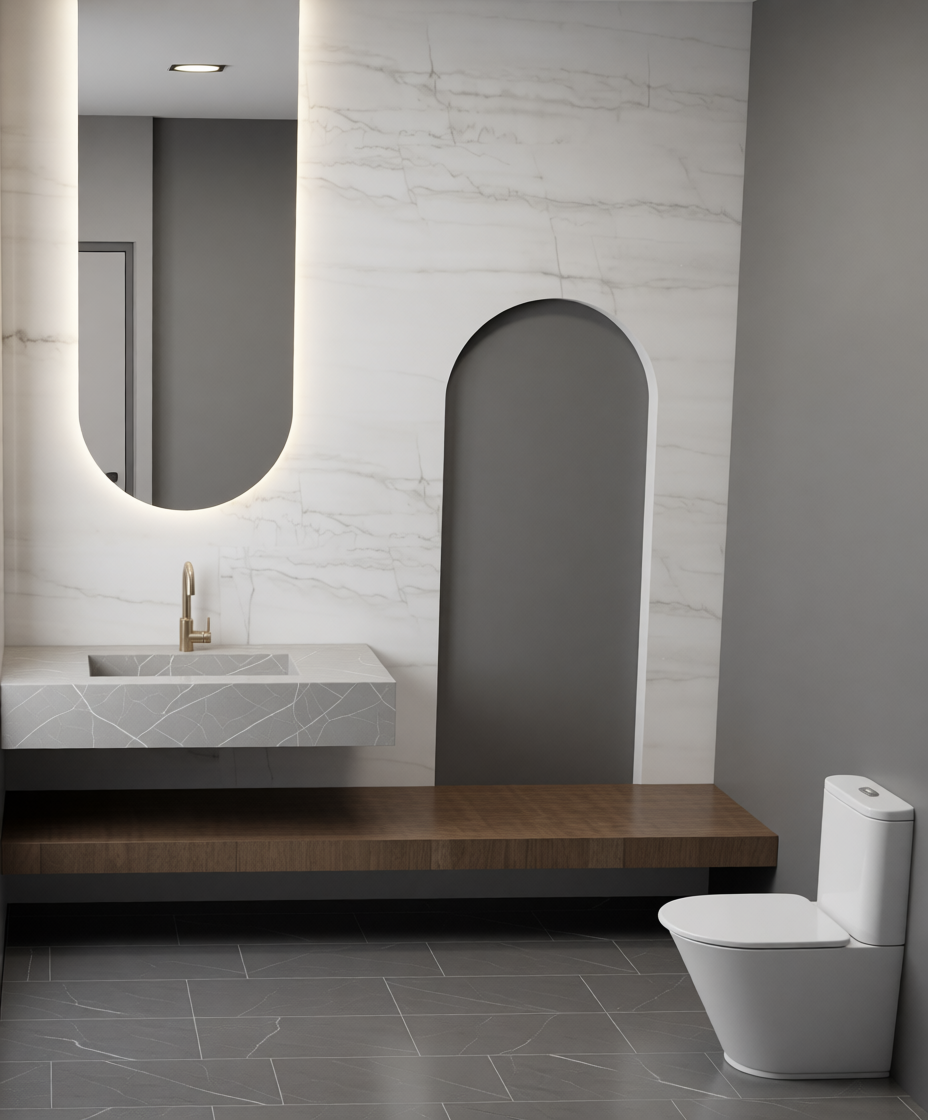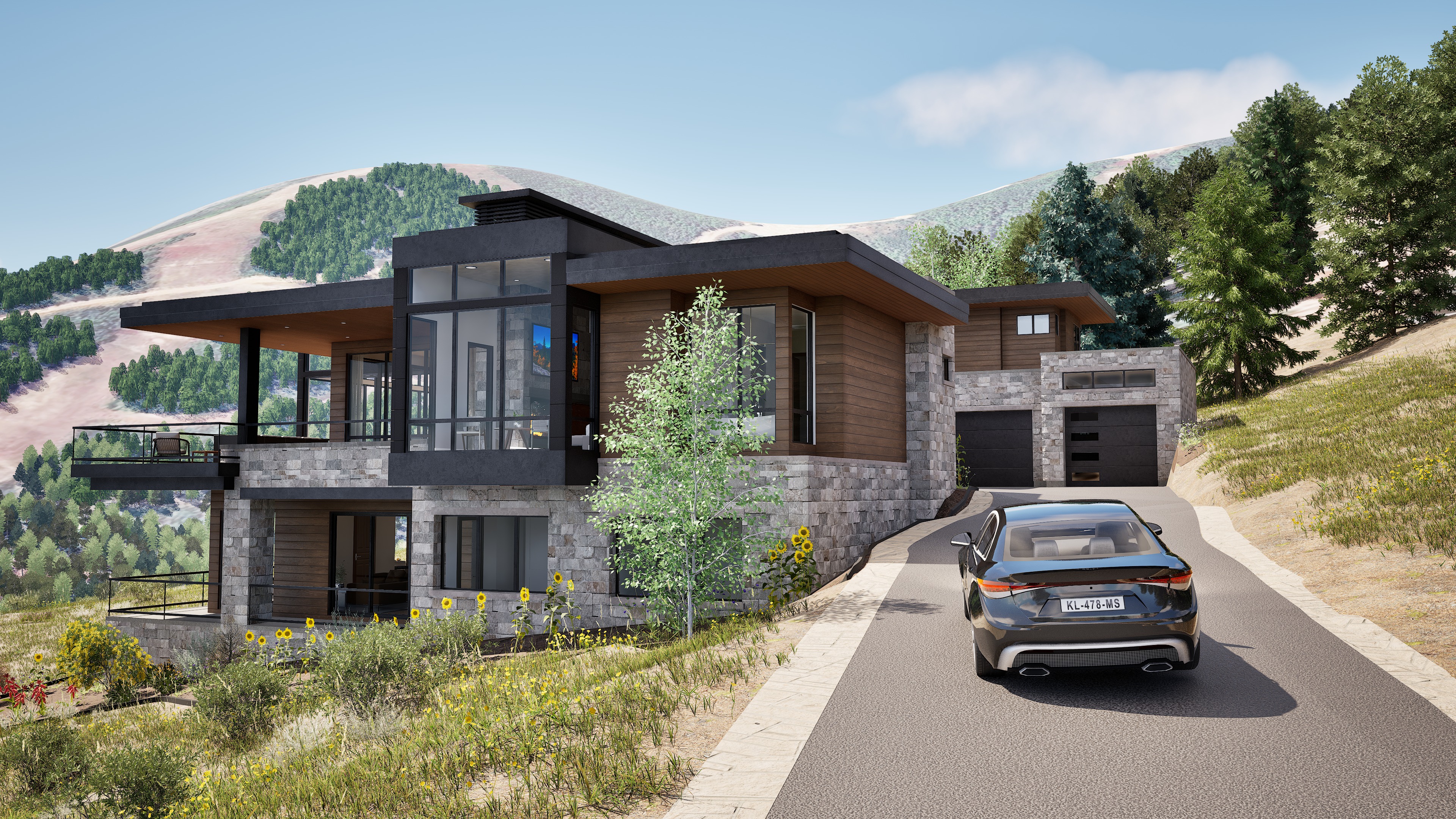 don t change the structure i want the environment to be a cool sunny day with a few clouds i want more vegetation on the mountains in the background and more landscaping around the exterior of the house add lights illuminating from the windows make the exterior materials feel more realistic and natural