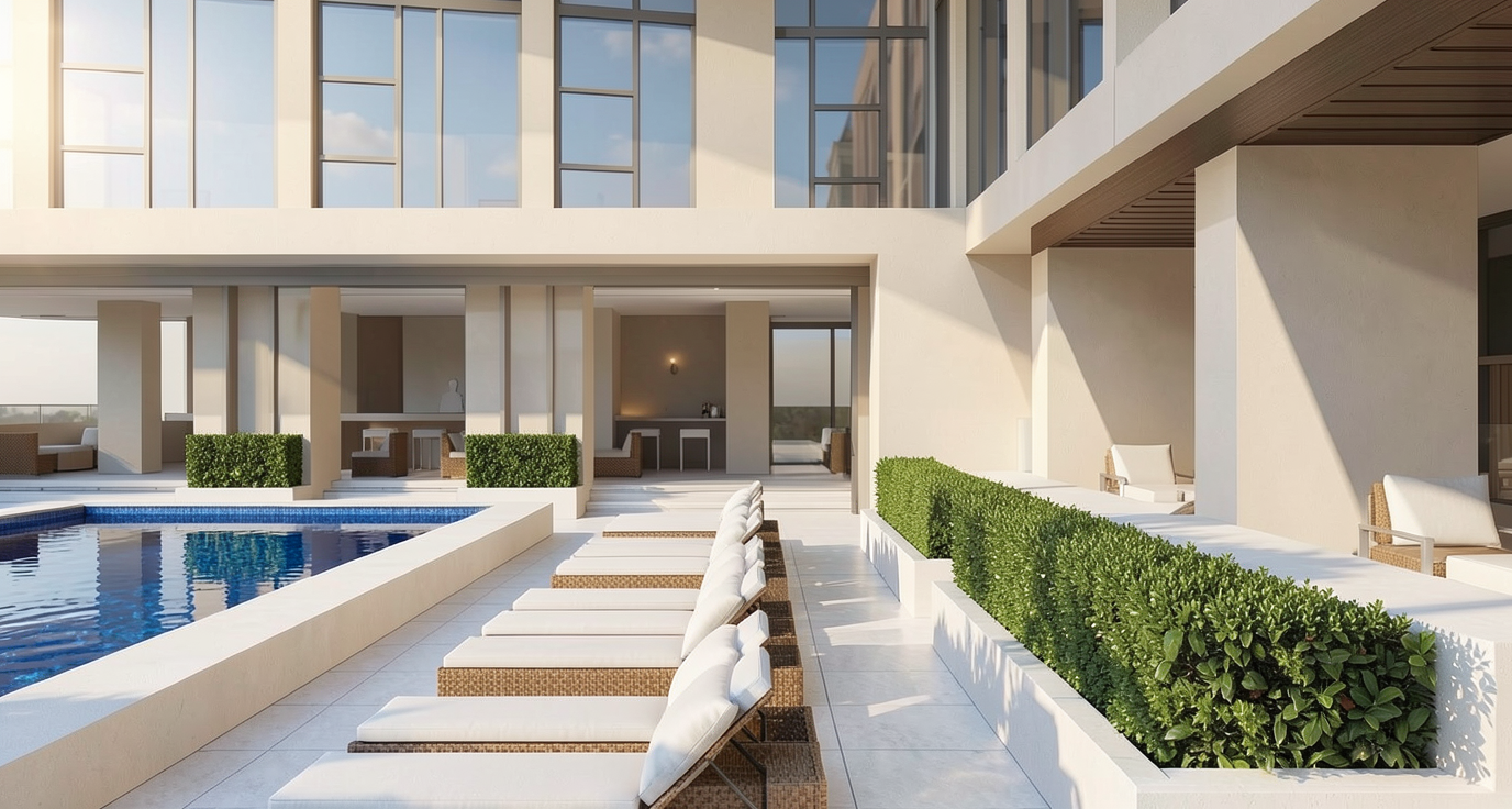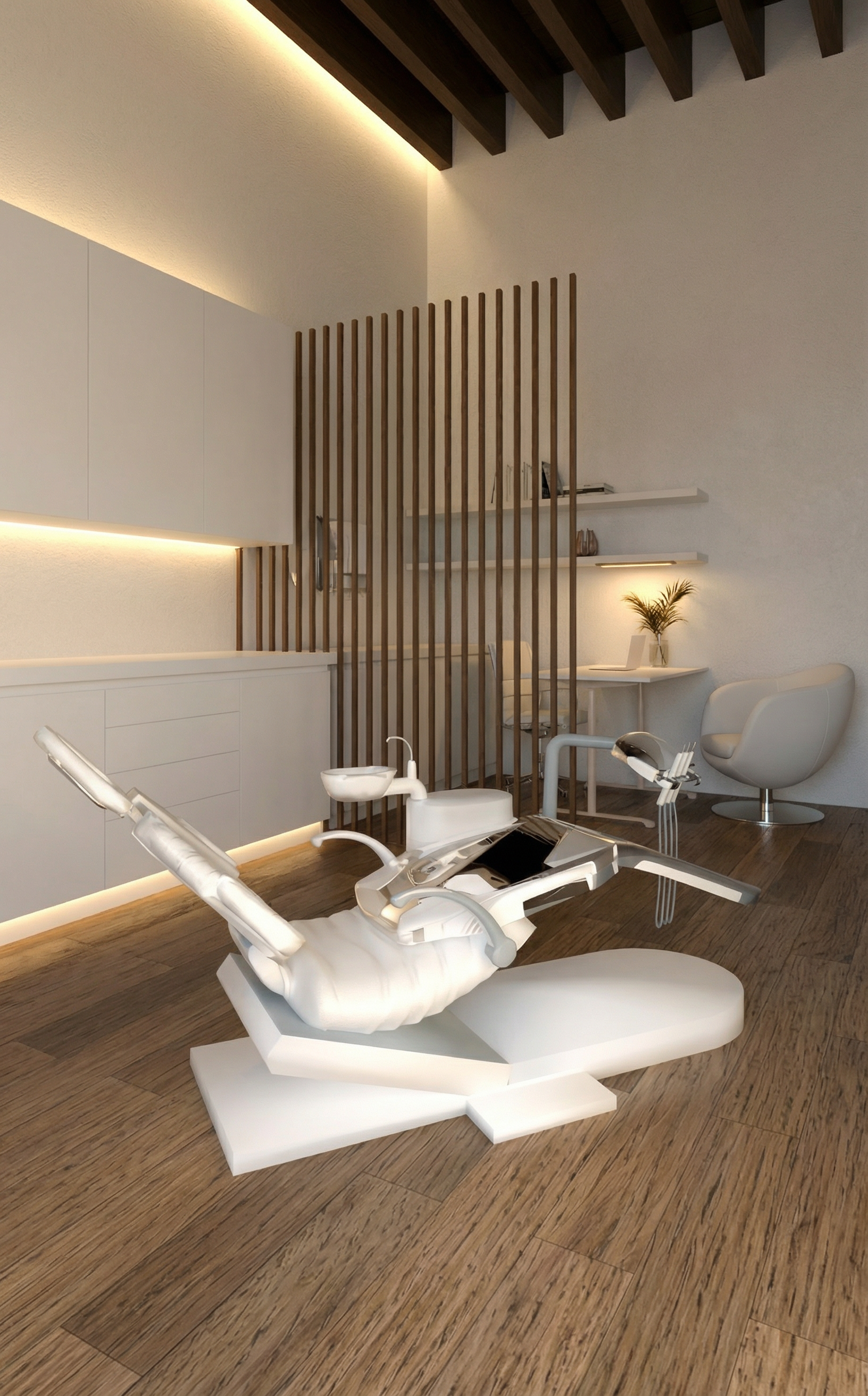 ultra realistic architectural render premium modern minimalist dental clinic interior scandinavian style biophilic design left zone realistic dental chair area white cabinetry integrated storage dental equipment ceiling lamp no windows indirect lighting natural oak wood floor exposed dark chocolate wooden ceiling beams right zone reception desk area modern white desk floating shelves behind desk decorative plants warm lighting small decorative partition wall separating both zones modern texture partial height divider soft daylight simulation cinematic lighting clean composition premium materials professional healthcare design photorealistic 8k quality interior architecture visualization luxury dental clinic concept