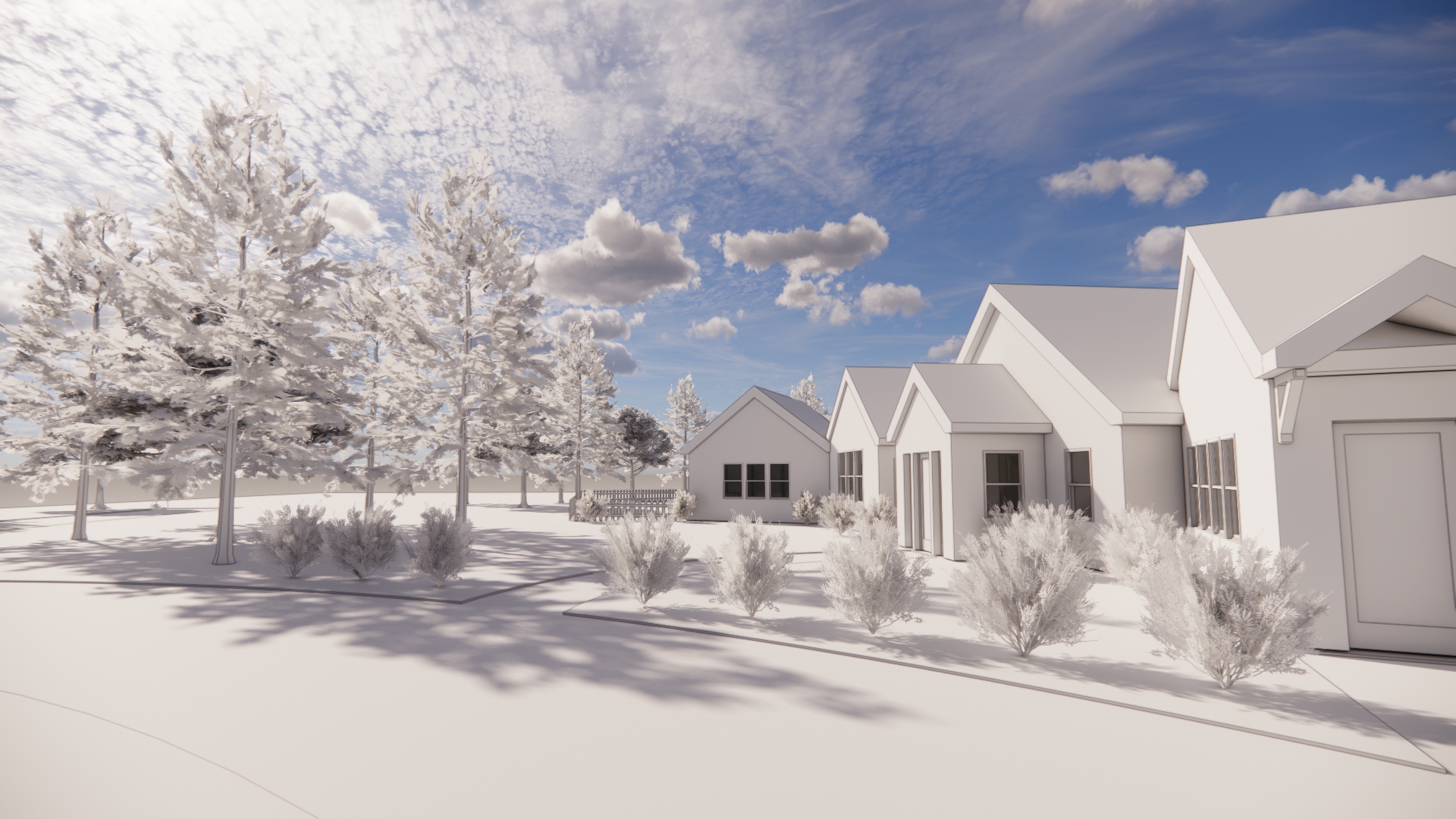 exterior shot please render this concept sketch use the forms as is the house is located in cape cod so materials are typical weathered cape cod house greyed cedar shingles on walls and roof painted white trim windows doors and roof trim chimney show grass in foreground with hydrangea plants as shown with blue flowers and crushed oyster shell driveway