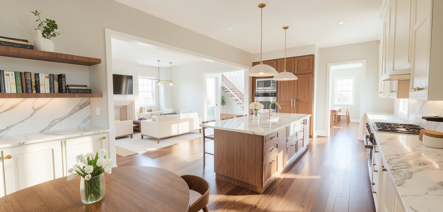 realistic warm kitchen with white marble