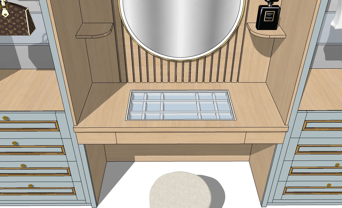 led lighting around mirror jewellery on display in organiser on vanity top