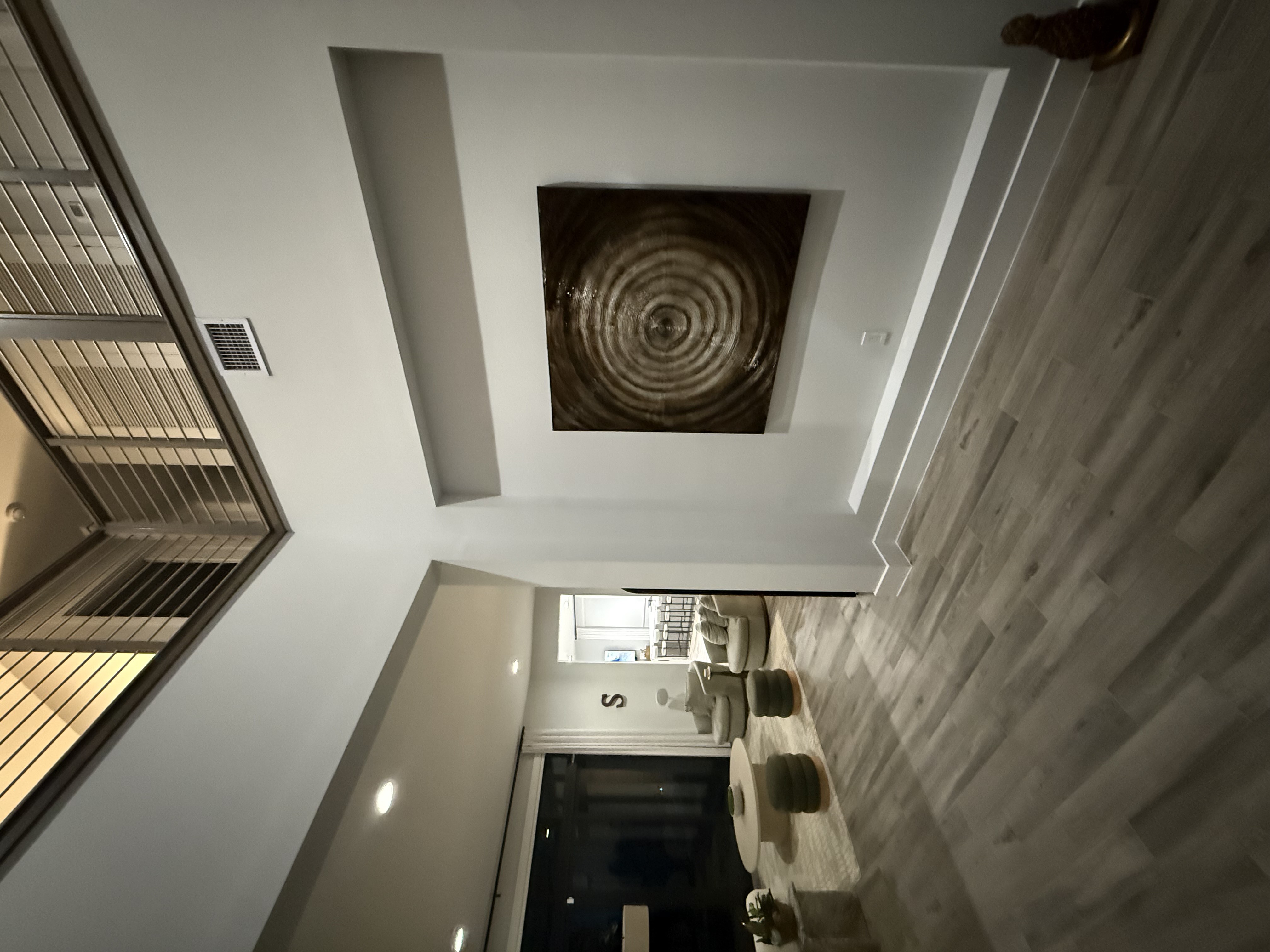 as an interior designer create an accent wall in this space get rid of the painting and make a unique design match the wood tone of the flooring architecture