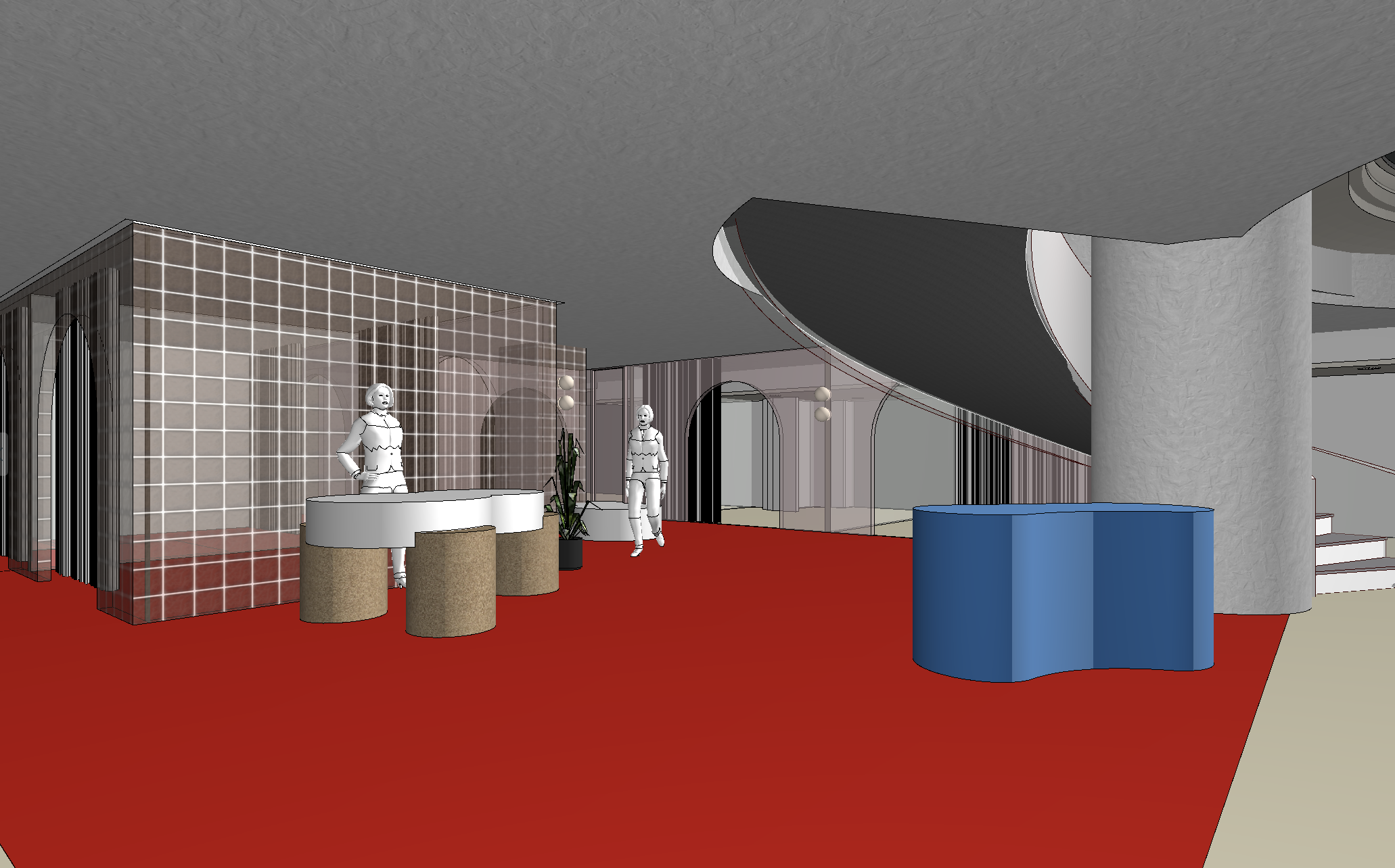 glass brick semi transparent wall behind table with hidden light glow between glass brick and ceiling on all sides change white table top to a rough terracotta finish also show the round lets in a rough terracotta finish show the red floor as white 600mm x 600mm tiled terrazzo tiles show the staircase and column in white show the consult rooms with arch entry in a light dusty pink transparent finish with white curtains show the 2 x people figures as real life 2 x looking females on the main round column show a neon sign saying beauty in upper case letters show a healthy green fiddle leaf where the current plant is also show lots of indoor plants under the staircase in various sizes show current light blue table in a bright navy blue