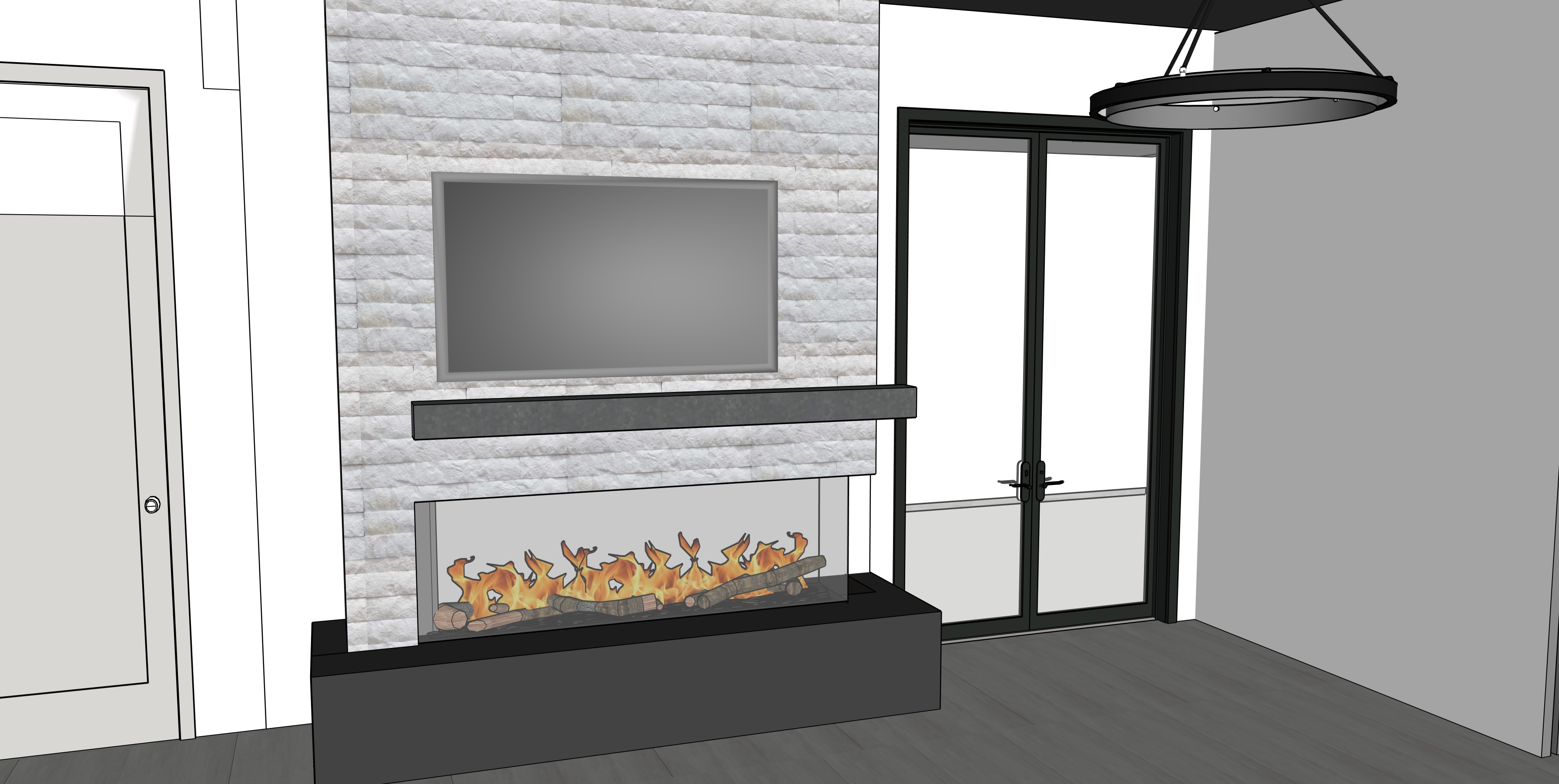 render an ultra modern room interior with high ceilings fireplace has a cold rolled steel hearth white textured splitface stone surround and concrete mantle floors are a light grey concrete tile the doors to the right lead to a private patio with water feature