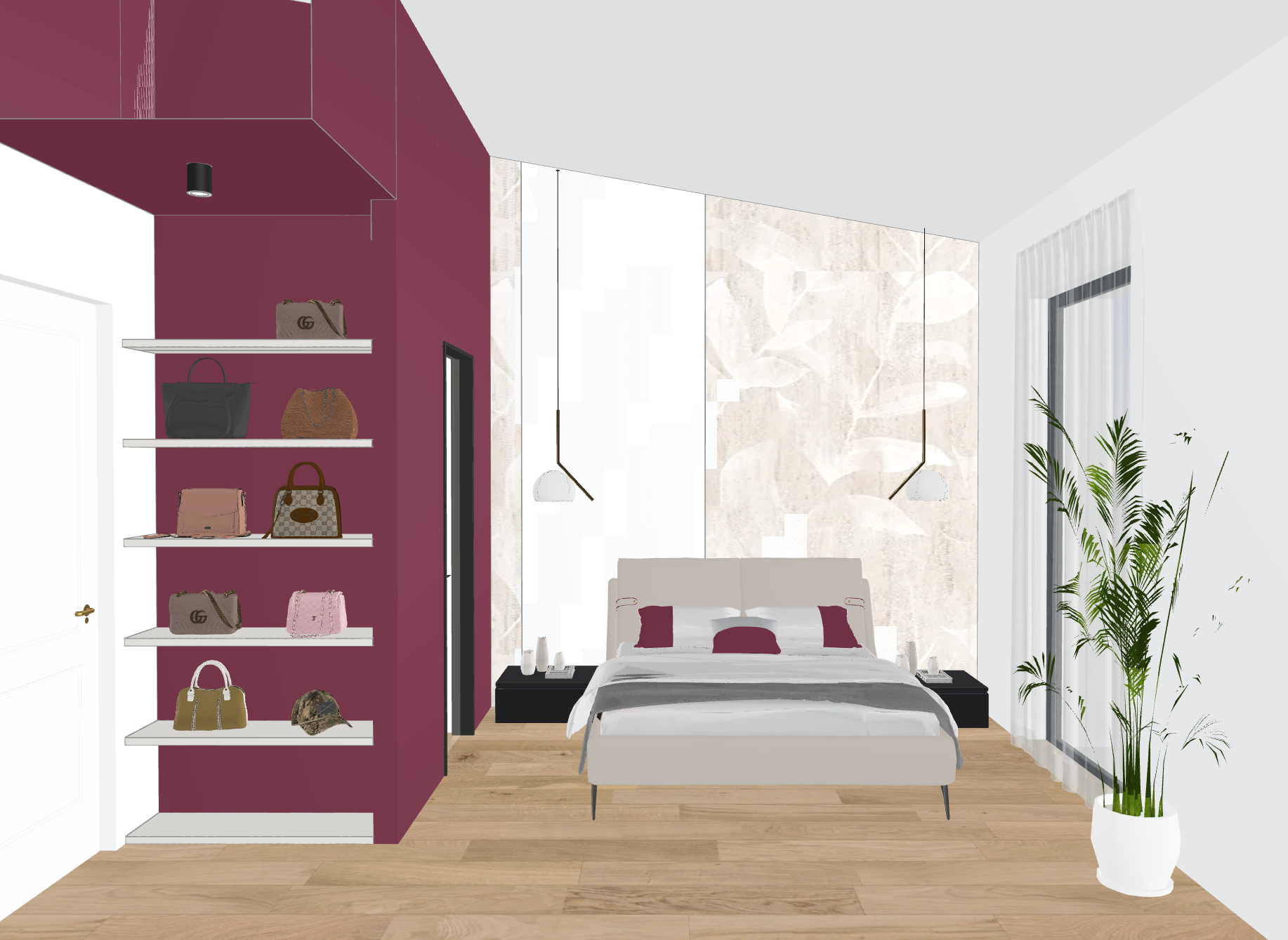 photorealistic interior render of a modern bedroom maintaining exactly the same composition proportions camera angle furniture layout and materials as the reference image the only modifications allowed are the following 1 central panel behind the bed only modify only the narrow vertical white panel aligned with the center of the bed behind the headboard this panel is visually distinct from the rest of the wall and positioned between the two bedside tables apply a vertical fluted ribbed texture only to this panel vertical cannettato texture evenly spaced ribs matte finish warm sand beige color soft neutral slightly warm strict constraints do not apply the fluted texture to the full wall do not modify the wallpaper behind the bed do not modify adjacent wall surfaces do not extend the texture beyond the exact width of the central panel 2 shelves with bags left wall add integrated led lighting under each shelf hidden led strip under every shelf warm white light 2700k 3000k soft downward illumination focused on the bags strict constraint do not add led lighting anywhere else in the room 3 pendant lights above bedside tables turn on both pendant lights soft warm diffused light low intensity atmospheric global constraints do not change any geometry do not move or replace furniture do not alter colors or materials of existing elements keep wallpaper floor curtains and decor exactly the same lighting primary light natural daylight from the right side window soft shadows and realistic light behavior artificial lighting must remain secondary and subtle style high end minimal contemporary interior ultra photorealistic rendering quality