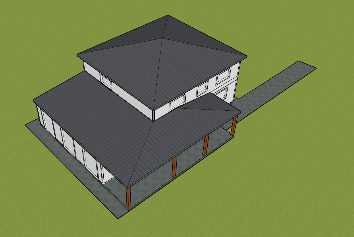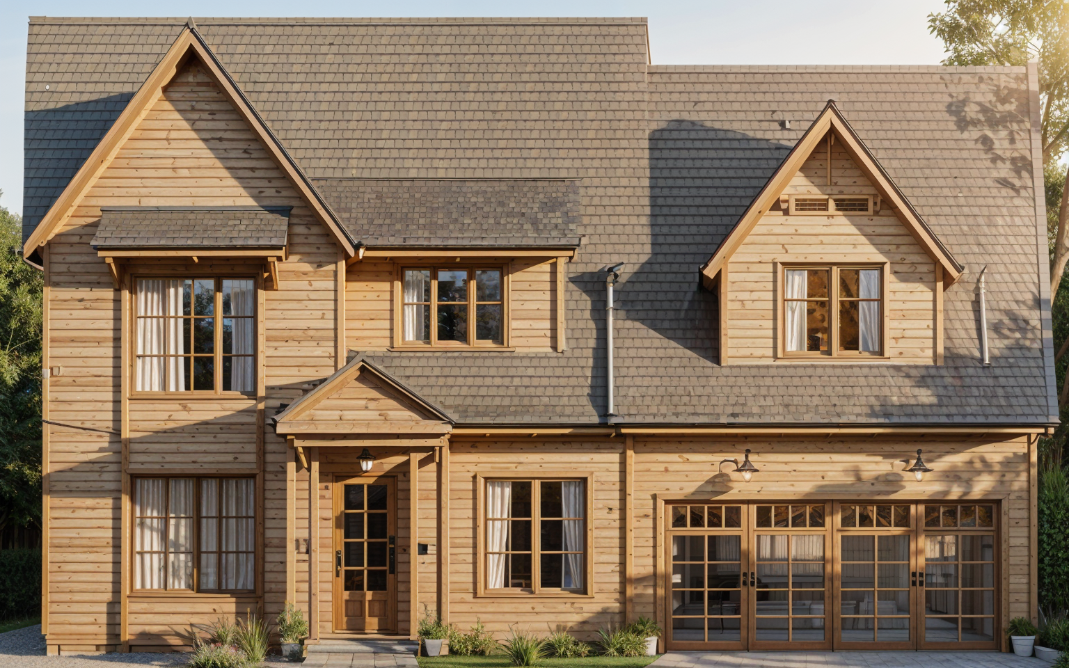 white stucco render dark grey window frames dark grey tile roof clean lawn in the foreground orchard in the background forest further in the background