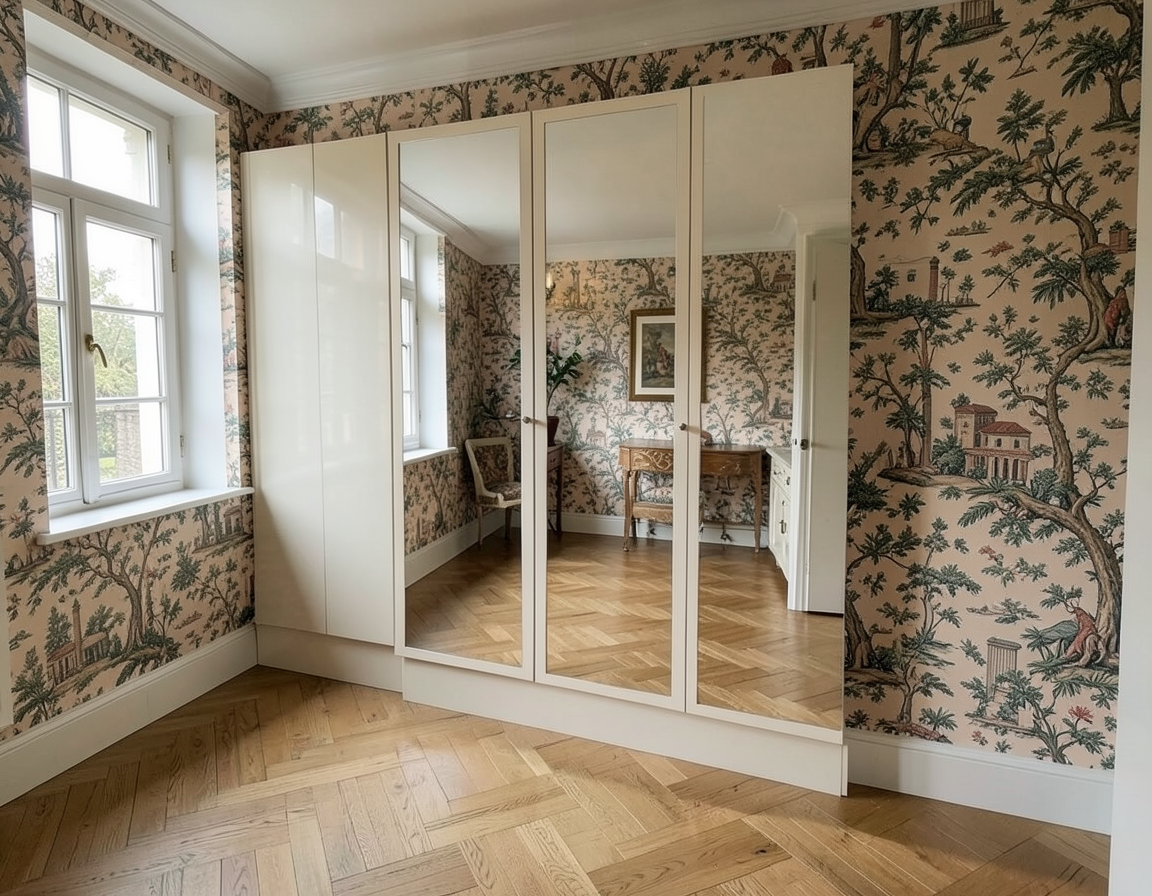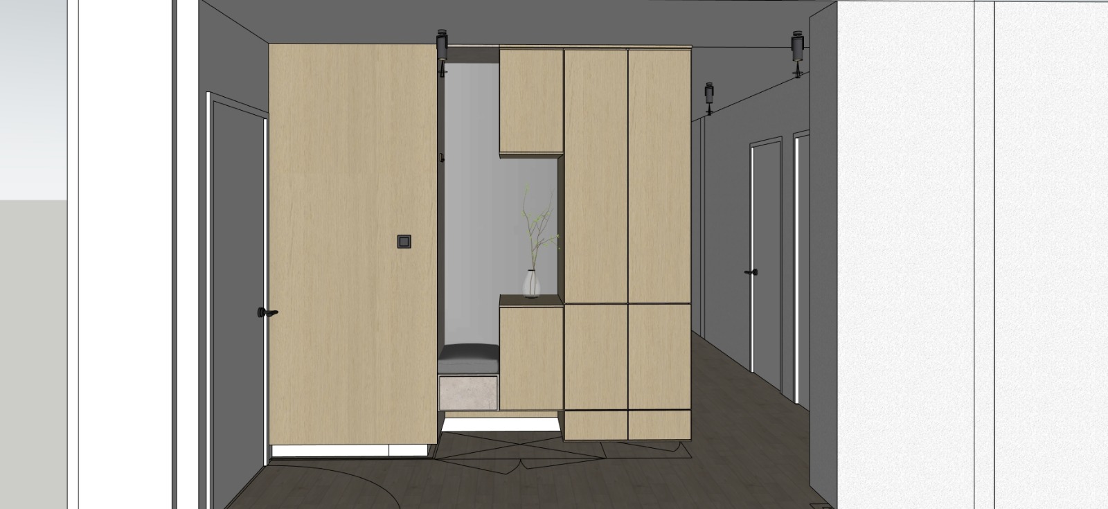 render a modern kitchen and dining area with an inviting and warm atmosphere use light oak wood for the cabinets and dining table to create a cozy feel the dining chairs should have a sandy beige tone complementing the light wood the walls should be a soft gray to add a calming contrast and add a subtle texture to them use a darker charcoal gray for the countertop and faucet to create a sleek contemporary look introduce a gentle warm lighting scheme that highlights the natural wood tones casting a soft glow throughout the space include a decorative plant in a simple white vase on the table for a touch of natural greenery