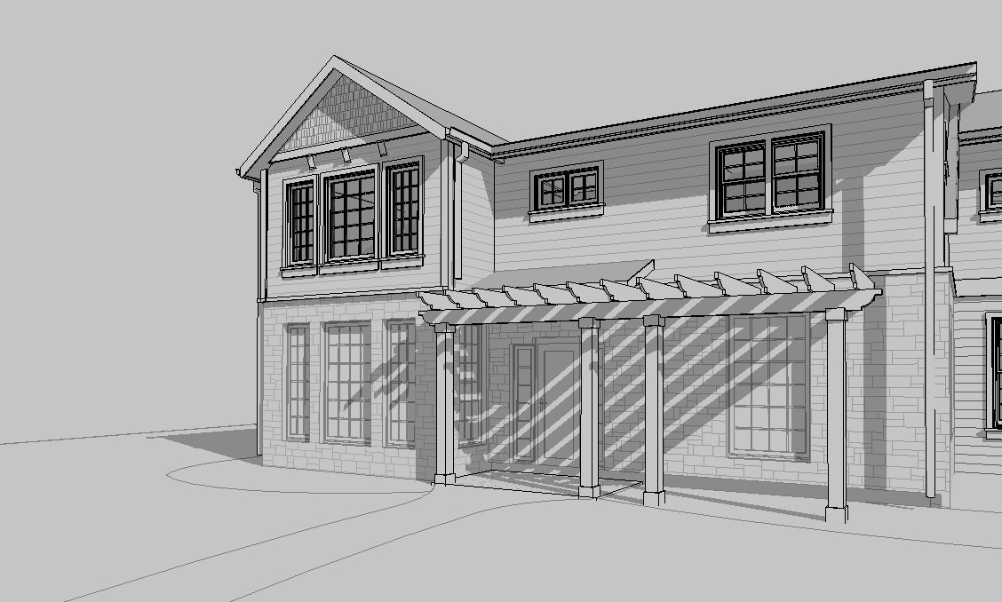 cape code style house subtle white horizontal siding and trim work 8 foot stone base grid windows entry patio with trellis walkway to door with mowed grass a couple large trees in background