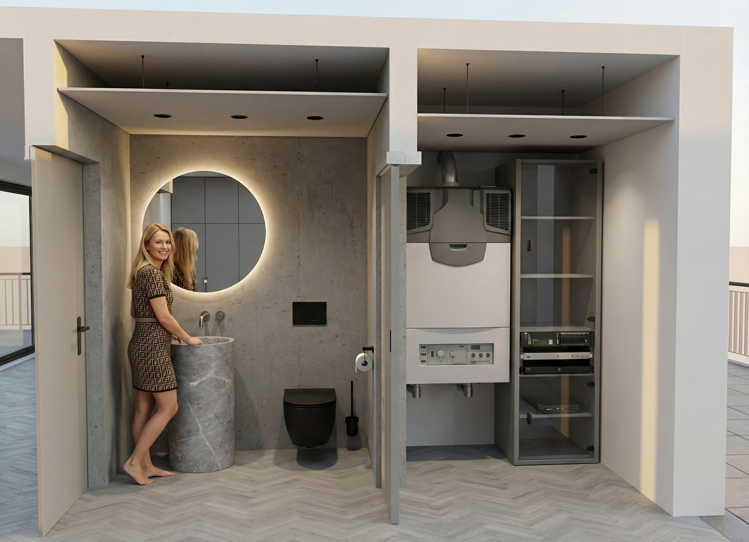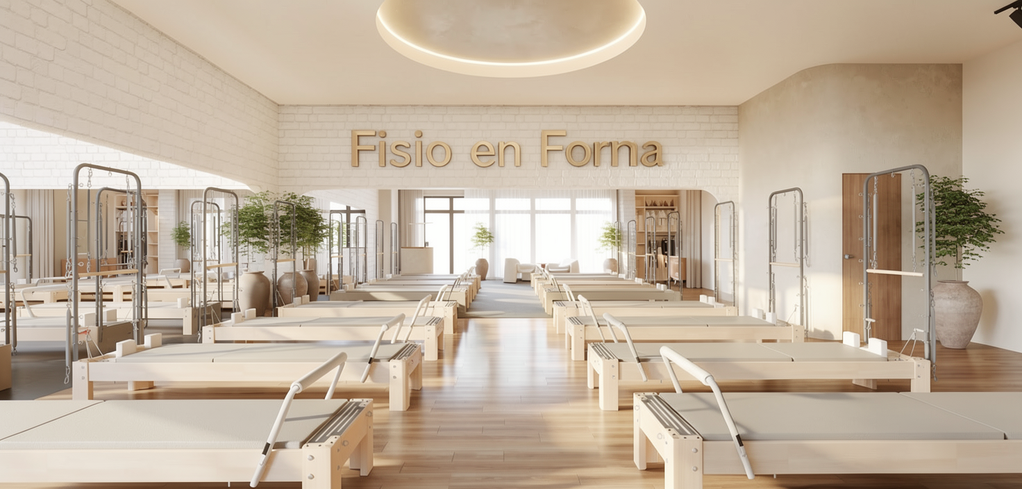 se the provided interior render as the base image keep the geometry and camera exactly the same walls techo suelos distribuci n espejos y aparatos de pilates fisio transform it into a clean bright photorealistic image of a pilates and physiotherapy studio called fisio en forma maintain the main colors and materials of the original render soft natural lighting warm but neutral tones and a calm wellness focused atmosphere do not change furniture layout or add new objects just improve realism textures reflections and lighting for a high end interior design presentation elimina el texto fisio en forma cambia el suelo a microcemento beige