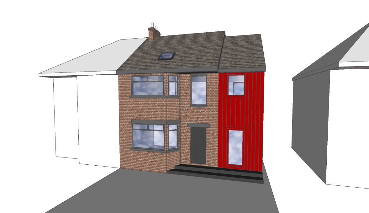 belfast traditional red brick with slate roof contempory side extension of rust red aluminium standing seam cladding it is set in a housing development formed of a street of similar semi detached properties place shrubs along the front of the house and tall trees behind the house the sun should illuminate the entire front of the house