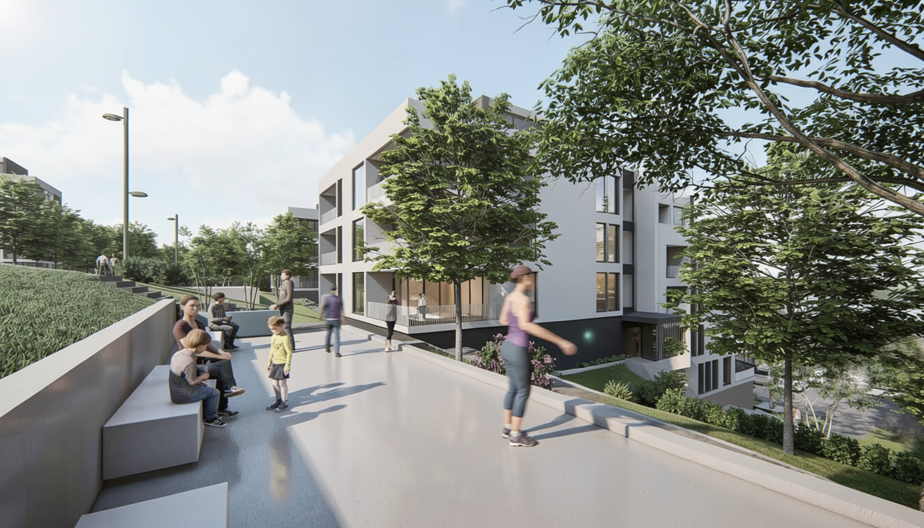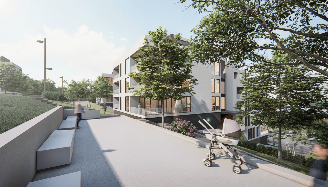 important preserve the existing geometry and the existing context exactly as provided do not modify alter reinterpret add remove scale or reshape any geometry do not change the site surroundings street layout neighboring buildings vegetation or context elements do not modify geometry scale proportions buildings road layout sidewalks or surrounding context in any way do not change text photorealistic architectural rendering clean and balanced contrast calm cinematic mood style contemporary european residential architecture minimalist premium understated include people subtle motion blur for realism do not add new peopledo not change the green space do not change the sidewalk do not change the road add reflection of the sorroundings to the windows remove the people remove the stroller