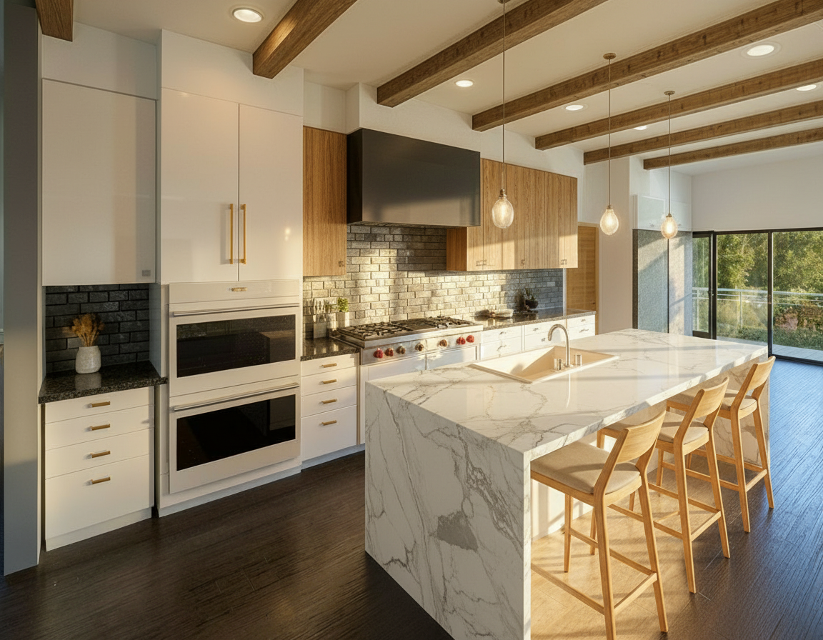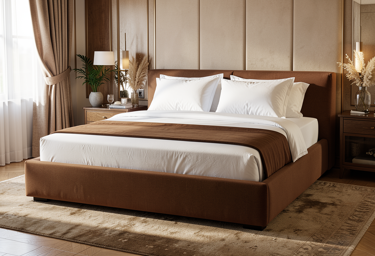 cria um render desta cama num ambiente branco p e len is brandos e as almofadas pousadas para ver se ver bem a cabeceira estofo arredondado como o modelo tecido alinhado castanho cor mel