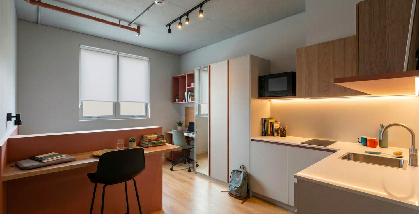 crea una imagen fotorealista a partir de este sketchup realza las texturas y la iluminacion a ade claridad a la imagen el armario de la derecha que tiene la puerta abierta a ade una tabla de planchar plegada