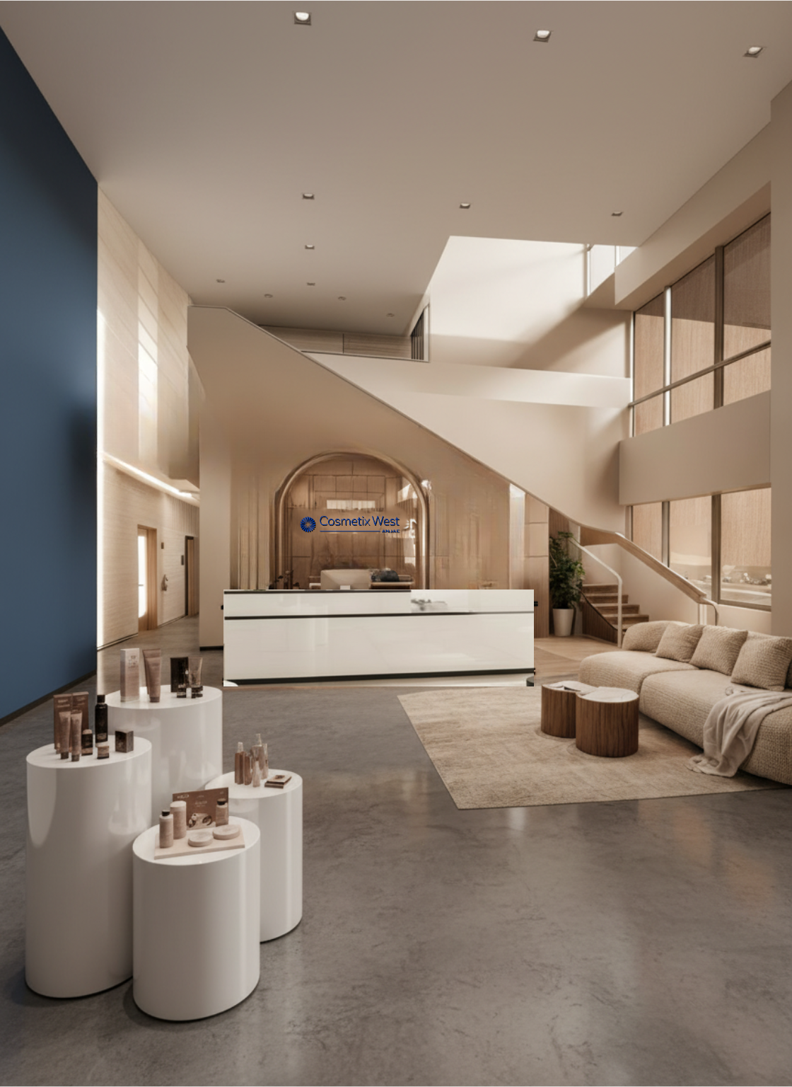 make this image look photo realistic remove the wood coffee tables and replace with black coffee tables keep everything else exactly the same make the reception desk look likethe reference image