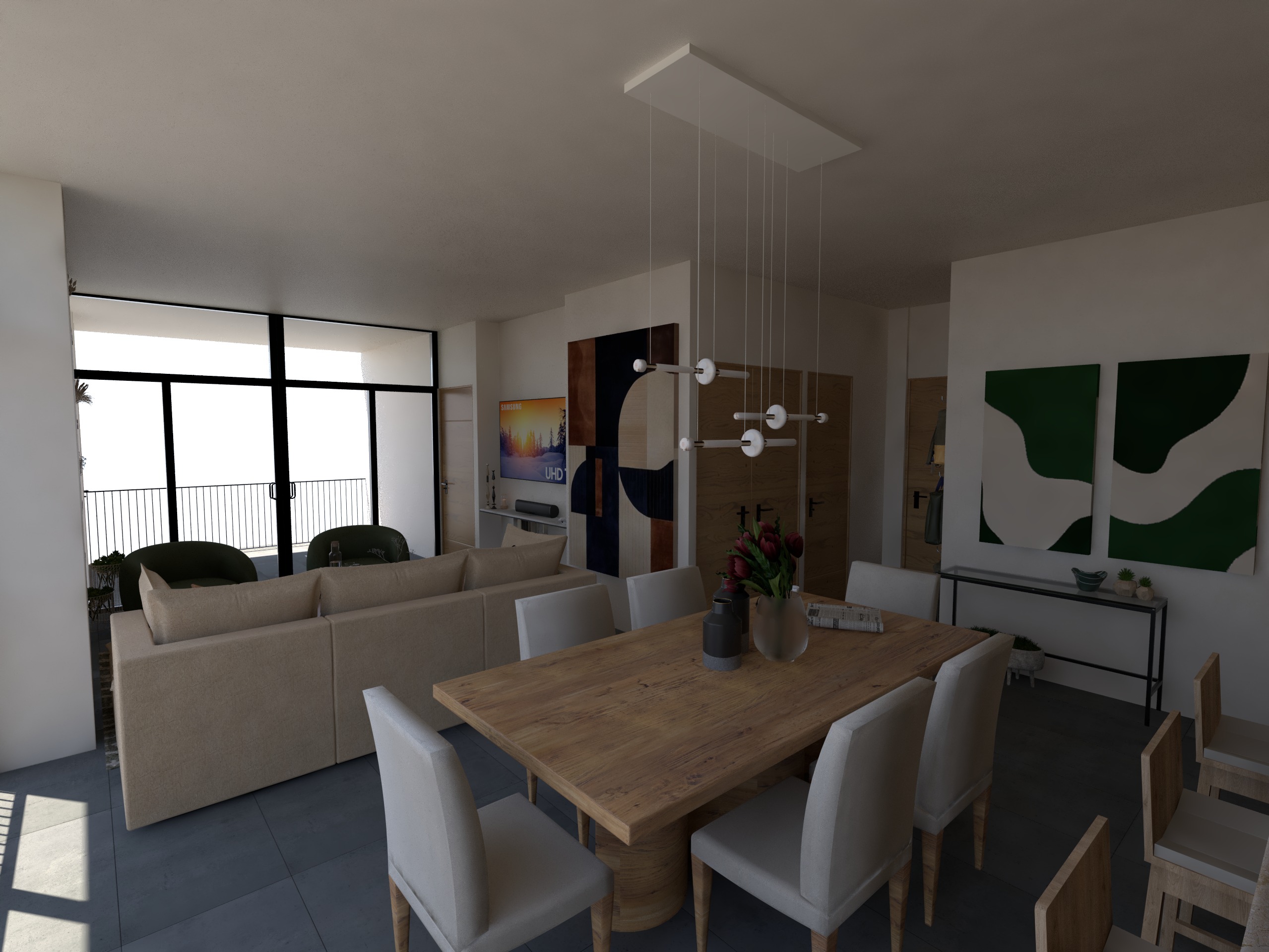 create a photorealistic enhancement of this luxury penthouse open concept dining kitchen living interior render maintain all existing furniture decorative elements textures beige upholstered sofa with black pillows white dining chairs wooden dining table wooden cabinetry and shelving modern abstract artwork green and cream geometric pieces do not modify white walls dark flooring modern pendant lighting fixture with white spheres tv console with display decorative vases and flowers and all architectural elements with their current colors and forms critical window view specification puerto vallarta penthouse perspective height reference 18 25 floors elevation replace the window view with an exact photorealistic recreation matching the penthouse viewing altitude shown in the reference image provided the cityscape must showcase puerto vallarta downtown not beachfront from elevated penthouse perspective featuring the iconic church of our lady of guadalupe parroquia de nuestra se ora de guadalupe with its distinctive baroque style ornate crown topped spire as the dominant focal point rising majestically above surrounding buildings 16 authentic spanish colonial era downtown architecture surrounding the church featuring whitewashed facades with terra cotta red tiled roofs creating characteristic warm architectural palette 27 charming colorful colonial plaza with cobblestone patterns visible from penthouse elevation perspective 2 pink hued church facade with authentic historical color rendering 7 multiple mid rise residential buildings and colonial structures extending across the cityscape creating depth from foreground to background 6 lush tropical palm trees and green vegetation distributed throughout the downtown district 5 authentic historic downtown puerto vallarta character and mexican colonial atmosphere 2 natural warm golden hour daylight approximately 4 5 pm with rich warm illumination and soft elegant shadows across the cityscape 39 the elevated aerial perspective must precisely match the reference image viewing angle and height emphasizing the downtown urban character while maintaining proper architectural depth and scale relationships from penthouse altitude critical specification tv display enhance the television screen with photorealistic display properties render it as an active modern tv screen with realistic black display surface showing authentic screen technology characteristics oled qled subtle internal glow simulation glossy reflective surface properties and realistic light reflection from ambient illumination the tv should display warm ambient content with appropriate pixel level detail and screen luminosity add sophisticated screen frame with metallic bezel showing realistic material properties implement advanced vray photorealistic lighting deploy sophisticated global illumination with realistic caustics and light refraction through the expansive window glass creating dimensional warm light patterns integrate premium hdri environmental lighting for authentic puerto vallarta tropical daylight simulation matching the golden hour reference add dramatic realistic warm sunlight streaming through the large windows creating rich golden light pools across dining table furniture surfaces flooring and walls creating cinematic warm ambiance significantly enhance all material quality add realistic wood grain depth and micro textures to dining table and cabinetry with authentic natural wood color variations enhance beige upholstered sofa with detailed fabric weave micro textures showing realistic light absorption and dimensional shadow modeling on folds and pillows render white dining chairs with subtle fabric texture and realistic light interaction properties preserve modern abstract artwork with exact form and color integrity green and cream geometric pieces no modifications enhance tv screen with advanced photorealistic display technology rendering render dark flooring with realistic material finish showing subtle light reflections add surface micro details to white walls with realistic paint texture and warm golden ambient light modeling improve lighting dynamics create dramatic warm directional light from the penthouse window casting sophisticated shadow patterns across all surfaces add realistic light bounce from warm wood tones and puerto vallarta sunset colors creating elegant ambient fill light throughout the open concept space implement proper light interaction with all textile surfaces showing realistic fabric behavior under directional golden light enhance reflections on glass window surfaces showing the puerto vallarta cityscape with church of guadalupe and sky add cinematic depth to all materials through proper ambient occlusion and specular highlights implement realistic reflection on tv screen from ambient and directional lighting apply premium color grading with warm inviting sophisticated luxury penthouse ambiance matching puerto vallarta golden hour elegant entertaining space with cinematic natural light implement realistic ambient occlusion for shadow depth in all corners architectural edges and furniture details include subtle cinematic depth of field with primary focus on the dining table and tv area ensure overall aesthetic conveys a sophisticated penthouse entertainment space with museum quality architectural design dramatic natural lighting and authentic puerto vallarta downtown cityscape character final render must achieve premium architectural interior photography quality with 8k resolution clarity professional styling and cinematic elegance matching the reference penthouse viewing altitude perspective