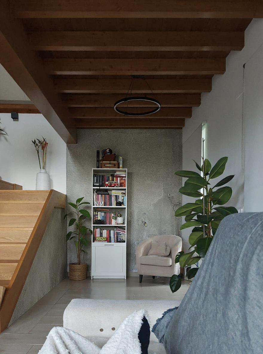 take off hte shelve and table and chair and replace for a nice full wall shelve with plants and books in metal and wood in an l shape to the stairs something quite bright not that sofa something escandinavian or modern style close the stair side with a shelve too