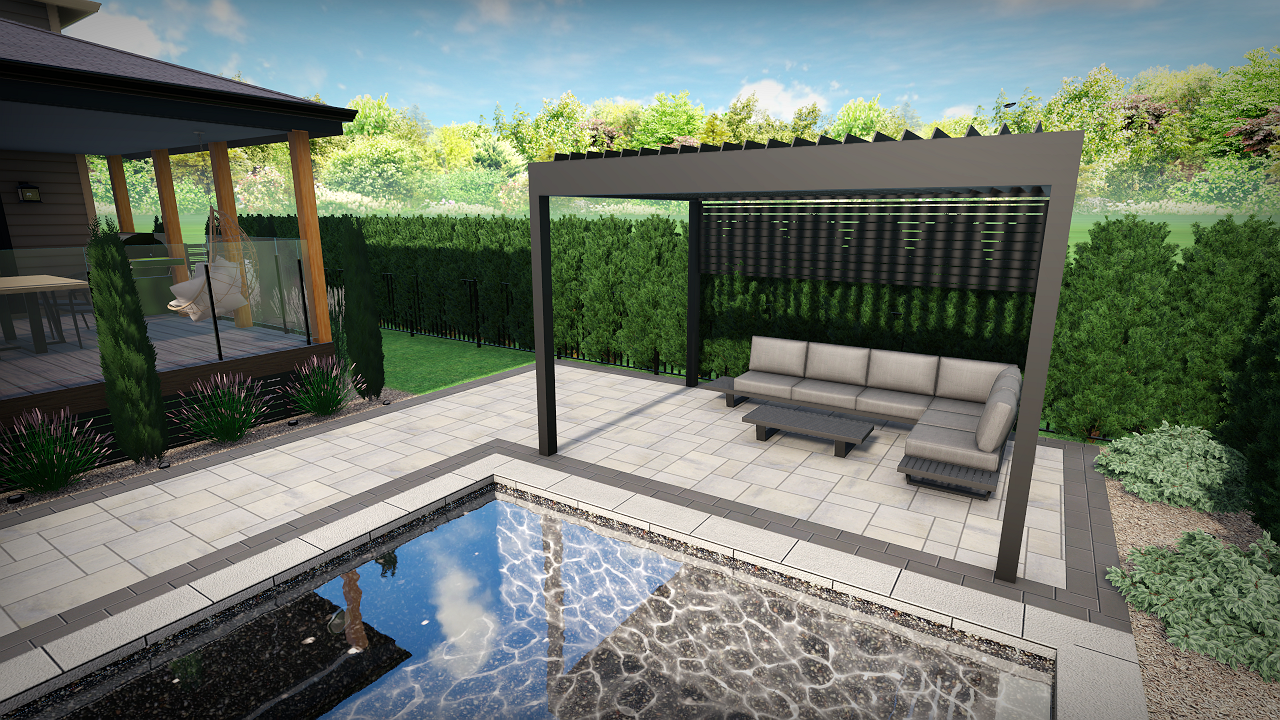 a serene backyard oasis featuring a modern pergola with a sleek gray metal frame comfortable light gray outdoor sofas with matching cushions are arranged under the pergola the tiled patio in shades of light beige and soft gray accents the arrangement beautifully lush vibrant green hedges provide a natural backdrop while neatly trimmed grass adds a touch of nature a crystal clear swimming pool reflects the blue sky above with gentle ripples capturing the sunlight the wooden deck with a warm brown hue and modern glass railings complements the setup the atmosphere is peaceful and inviting perfect for a sunny afternoon retreat
