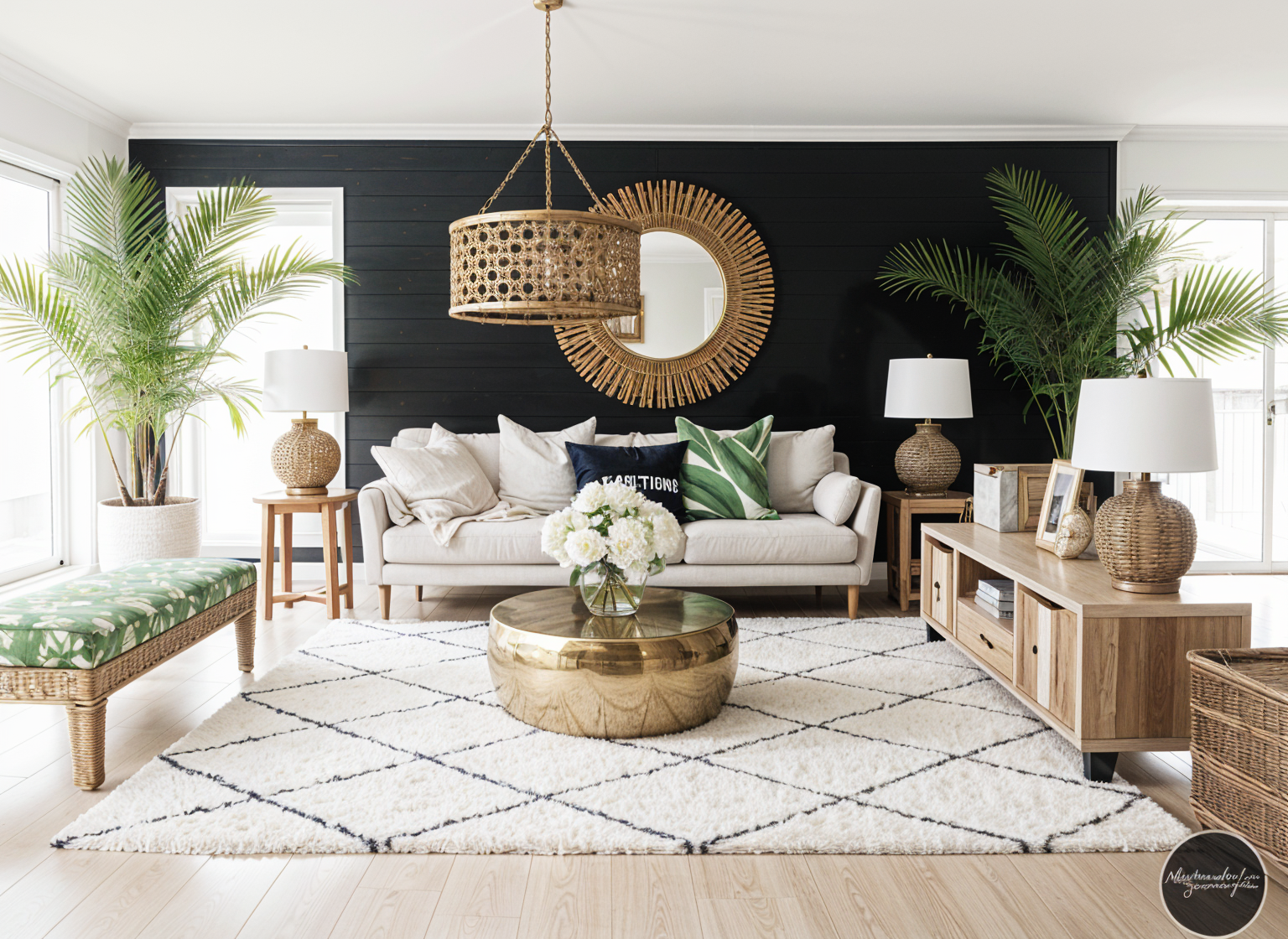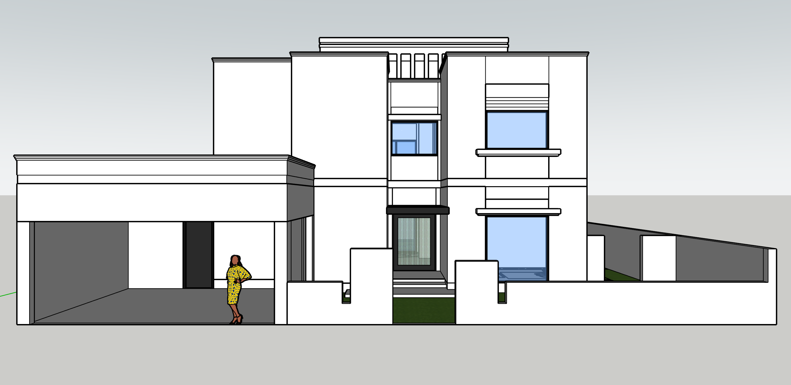 modern minimalist house with a plain white facade and sleek lines large blue tinted glass windows the garage has a light gray interior the lawn is a vibrant green a person in a bright yellow patterned dress stands outside the atmosphere is calm with soft natural lighting enhancing the clean and contemporary aesthetic add step lighting at the front porch main door with fluted glass add modern water feature at the right side wall tall trees at the back dark red suv at the front garage sunset view add modern wall sconces architecture