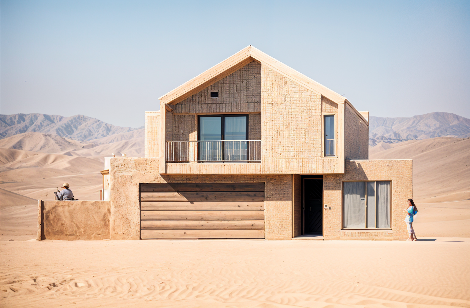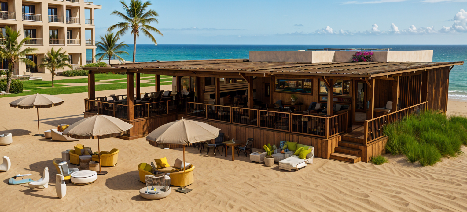 beach club restaurant before sunset with indirect light in the bar at the background and spot light from the floor lighting the columns indirect strip light all around the deck light olive taupe upholstered furniture more light inn the model please the sea is right bellow audience won t see it