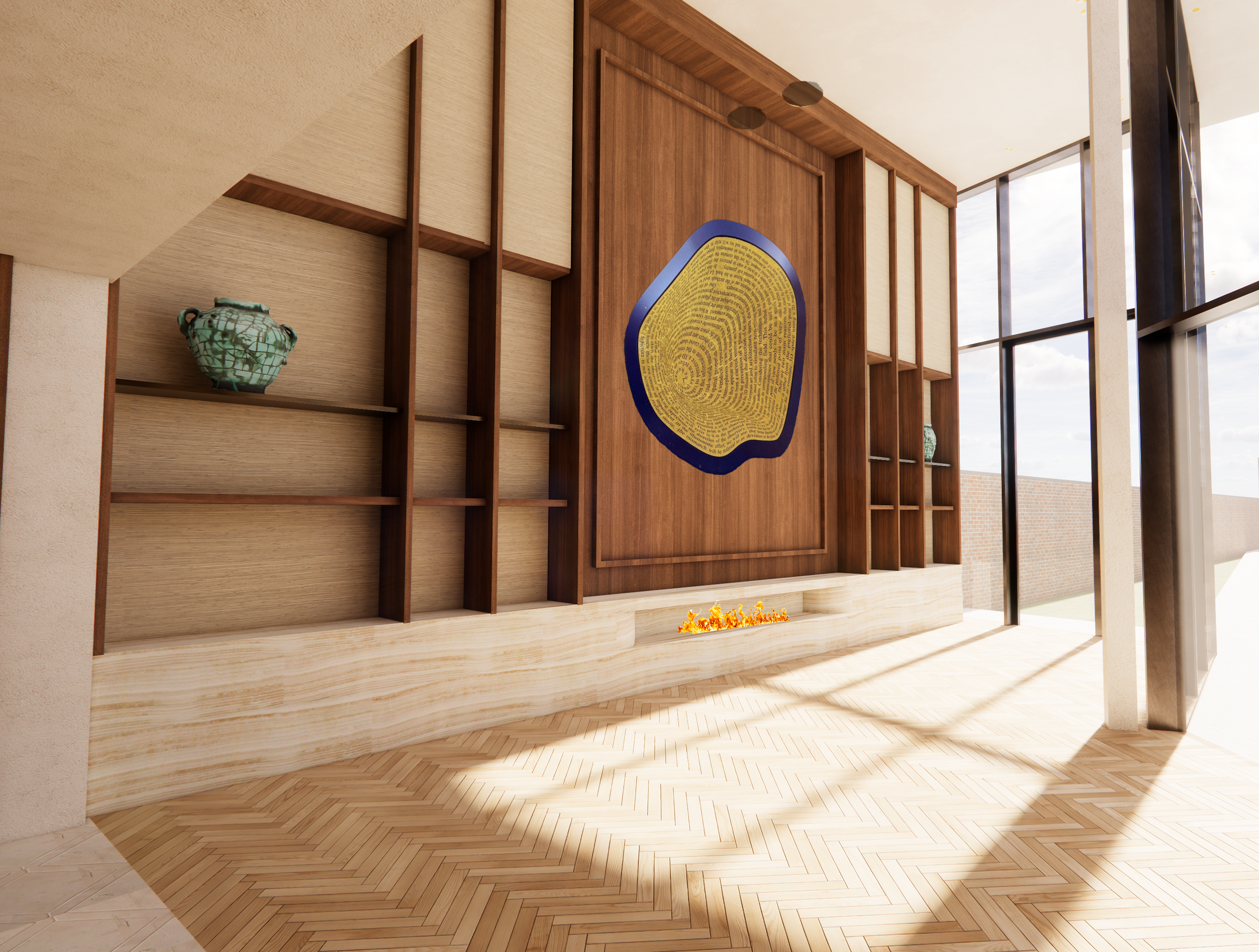 add subtle warm led lighting beneath each bronze shelf to create a soft even glow that gently illuminates the back panel maintain the existing design composition and materials focus solely on refining the lighting and enhancing the rendering for greater realism and a luxurious lifelike appearance additionally make the fireplace flame more realistic with natural movement depth and warm color variation refine the artwork to appear more realistic and harmoniously integrated into the overall scene