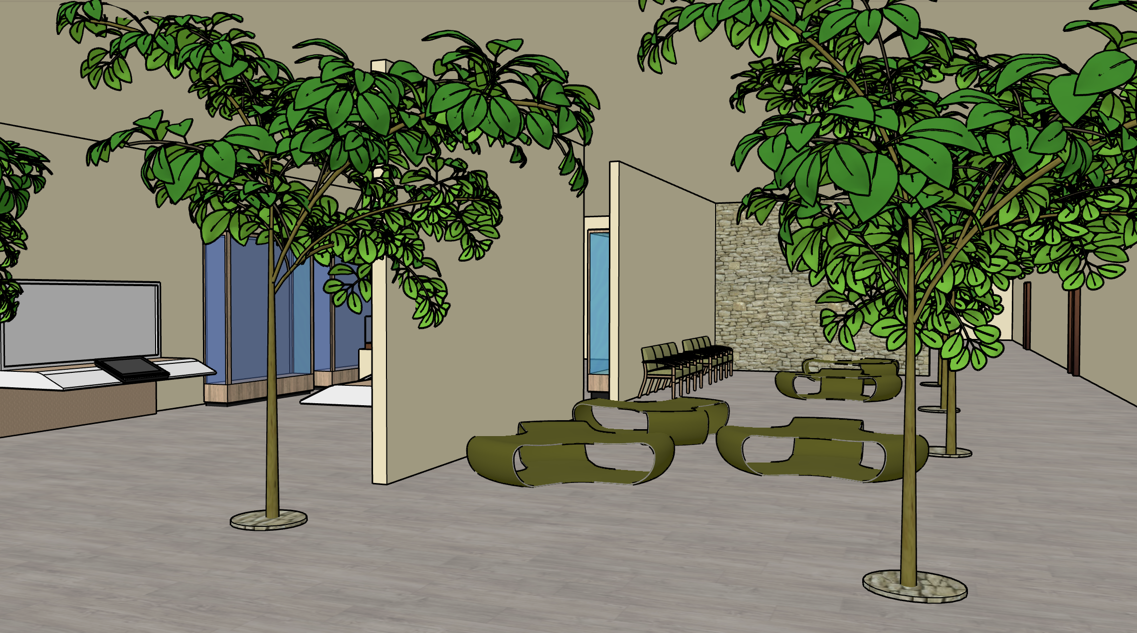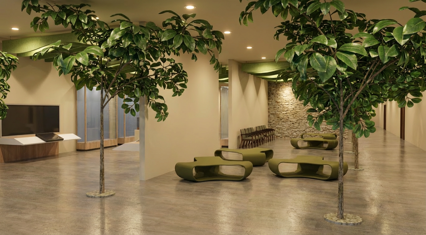 nature museum seating area and exhibit on the other side each area has its own rectangle acousitc ceiling baffle that is green with an organic flowing shape recessed downlights are integrated in the ceiling and within the baffles floor is a concrete stone look natural and artificial lighting