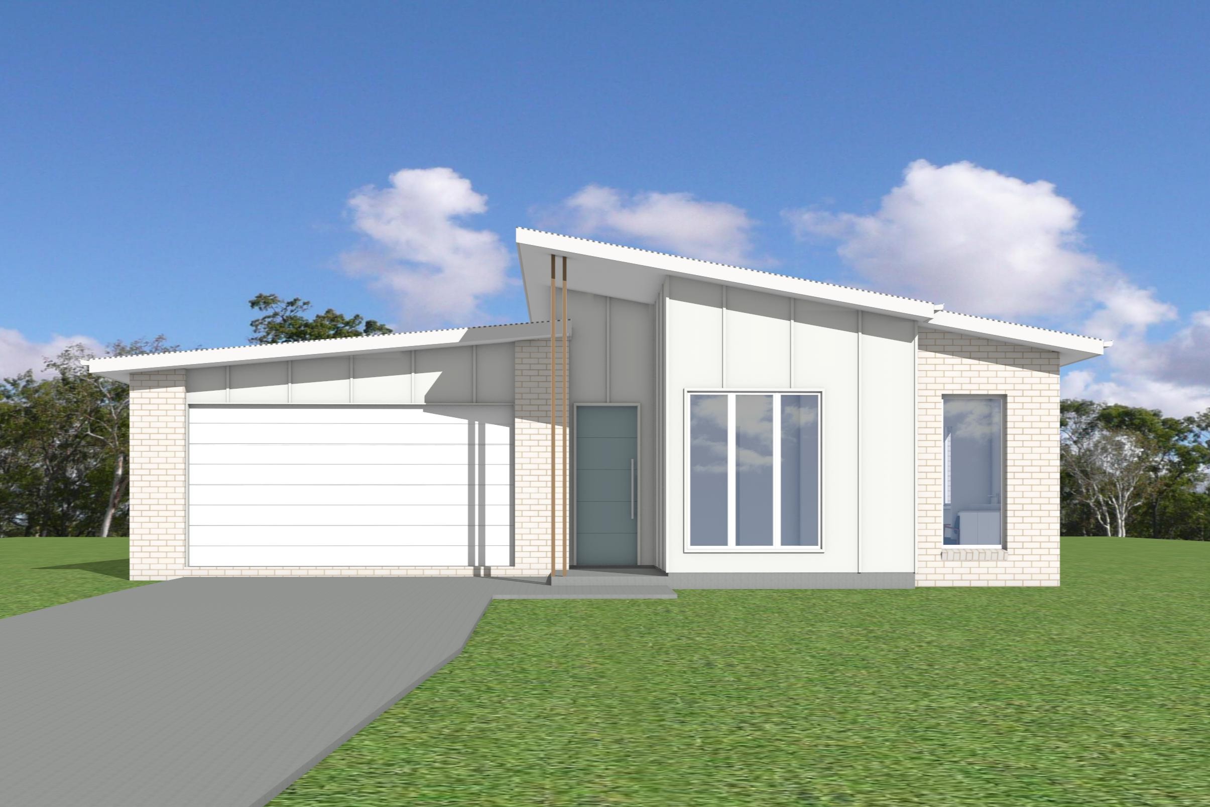 modern minimalist house with a slanted roof crisp white brick exterior and large white reflective trimmed windows the driveway is a sleek gray smoothly transitioning to a lush vibrant green lawn low coastal planting to the front yard and surrounding leafy trees in deep green capture midday lighting with clear skies casting gentle shadows on the lawn