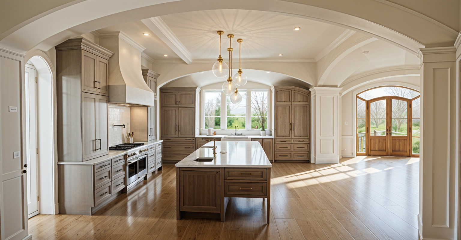 photorealistic interior polished tile floors white walls and light metal orange frames with black and white graphic inside the space is lit up with soft ceiling soft lights orange metalic perforated panel in the center of the ceiling black and white graphic image back wall on the left wood wall on the right with orange accents bright lighting and overall environment is soft bright lighting view outside of clear glass of second story above looking down about 10 feet below aerial of parking lot with trees in the afternoon