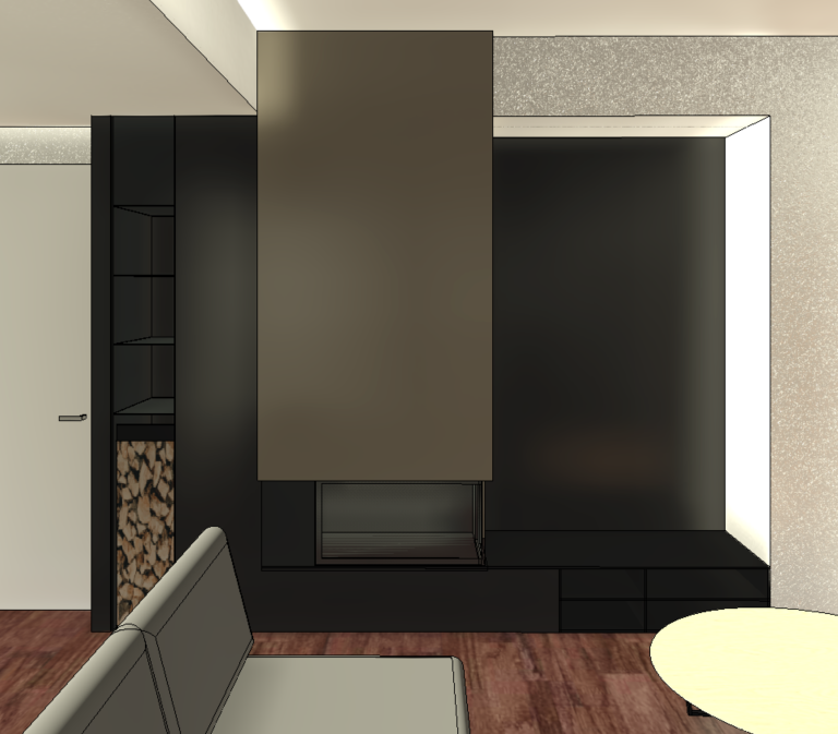 transform this architectural view into a high end photorealistic interior render preserve 100 original geometry volumes proportions alignments perspective and camera position do not redesign reinterpret or modify architectural elements maintain sharp edges and original structure natural soft daylight entering from window side interior lighting calibrated like professional architectural photography neutral warm white balance 4600 4800k balanced exposure soft highlight roll off realistic global illumination soft contact shadows natural dynamic range no dramatic or cinematic mood material system floor dark oak hungarian herringbone parquet matte finish visible wood grain subtle plank variation low reflectivity realistic depth dark wall and fireplace base lead grey plaster matte slightly textured deep tone uniform surface clearly darker than upper volume light walls and ceiling fine white plaster soft matte diffuse light behavior fireplace upper suspended volume textured taupe plaster warm grey tone matte finish subtle material variation fireplace frame and internal vertical element black matte iron dark metallic surface subtle micro reflection non glossy fireplace glass transparent with realistic refraction and soft reflections wood log storage realistic stacked firewood varied diameters irregular cuts visible bark texture natural cracks color variation from beige to warm brown visible end grain depth between logs strong contact shadows no repetitive pattern shelf styling minimal contemporary decor 3 4 neutral hardcover books small matte ceramic vase minimal wooden box balanced spacing no clutter realism enhancement physically accurate materials micro surface imperfections slight roughness variation on plaster subtle edge softening on sharp corners natural light falloff on walls reduce digital uniformity no color shift no material blending no surface merging photographic architectural realism similar to corona renderer daylight interior clean soft natural elegant atmosphere