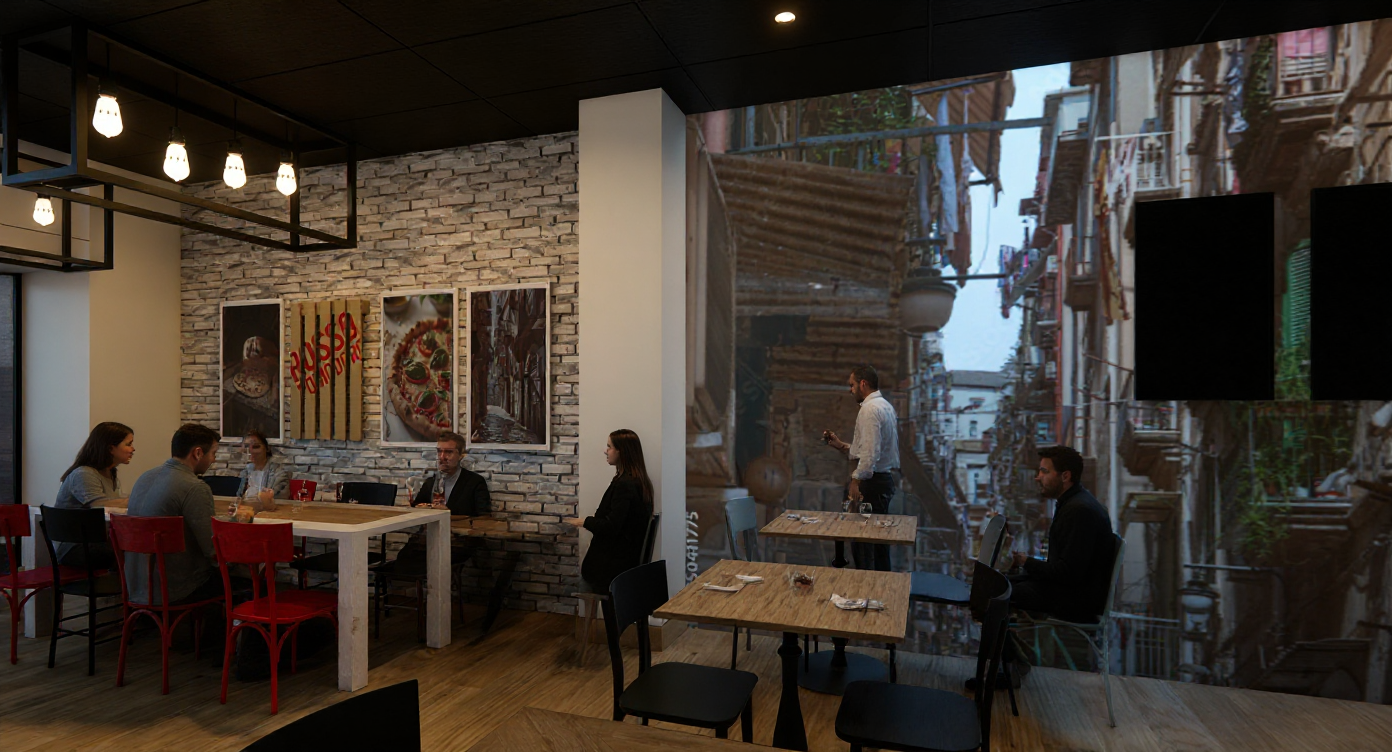transform the provided restaurant interior image into a high end photorealistic render do not change the materials do not change the proportions do not chnage or add furniture only render the existing materials more photo realistic the brick is white bleached brick with light colored groun the photo on the wall is a wall paper the red black and white chairs are all on painted wood which shows some of the wood grain