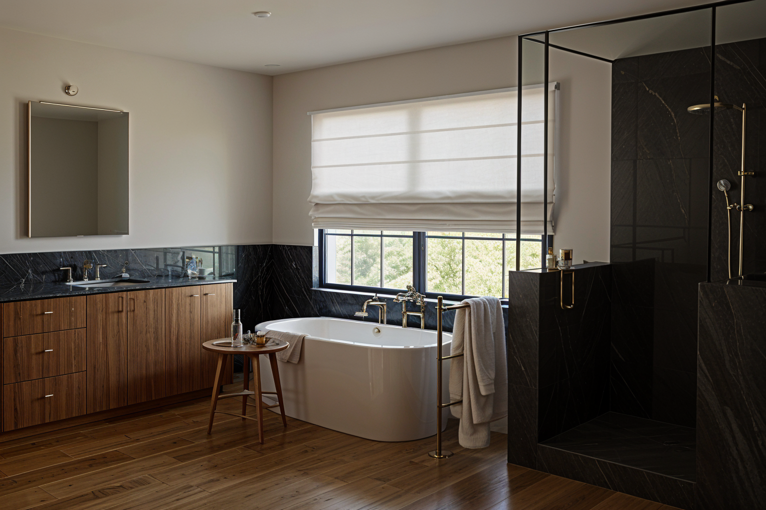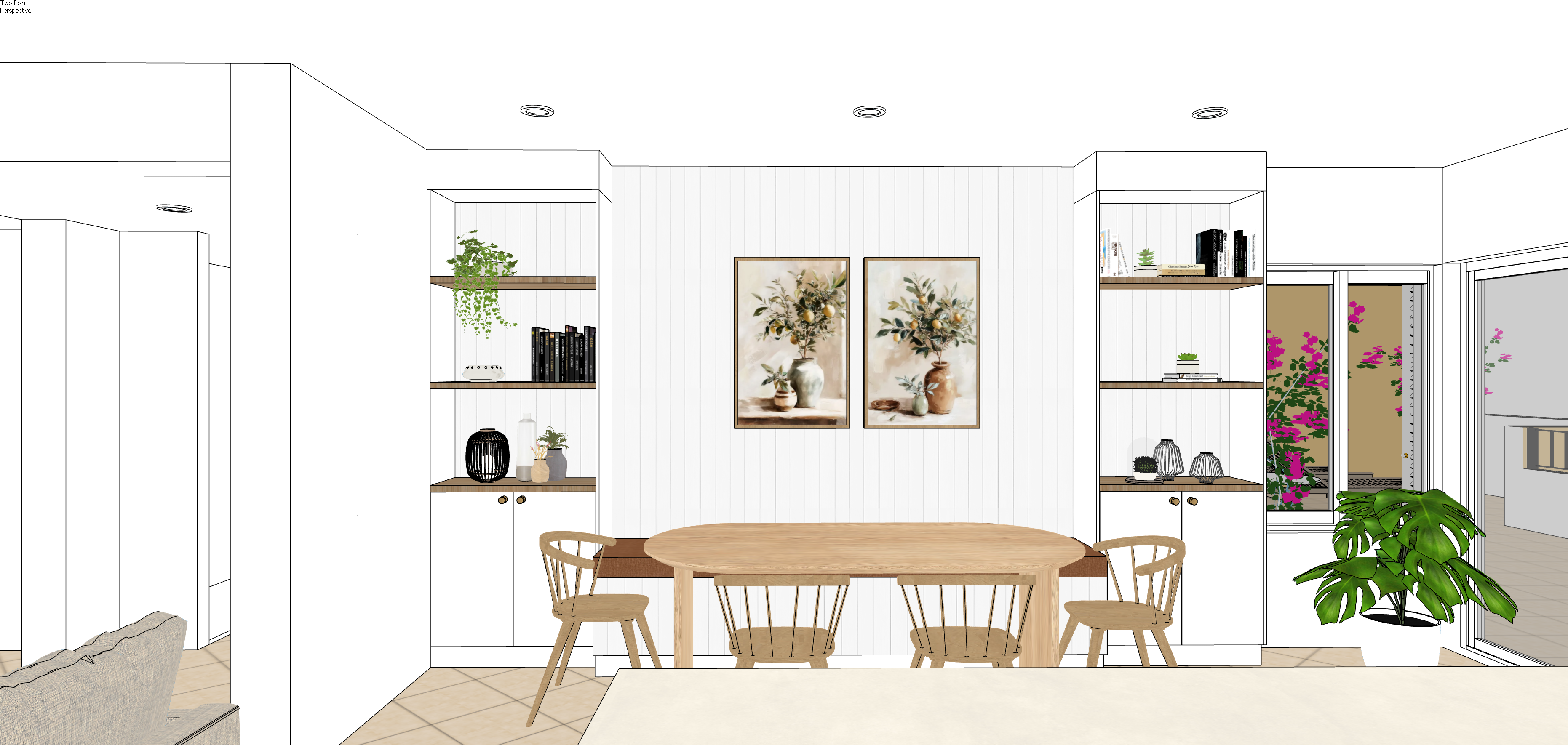 warm white dining nook joinery with oak floating shelves on on a sunny day use exact pieces of furniture