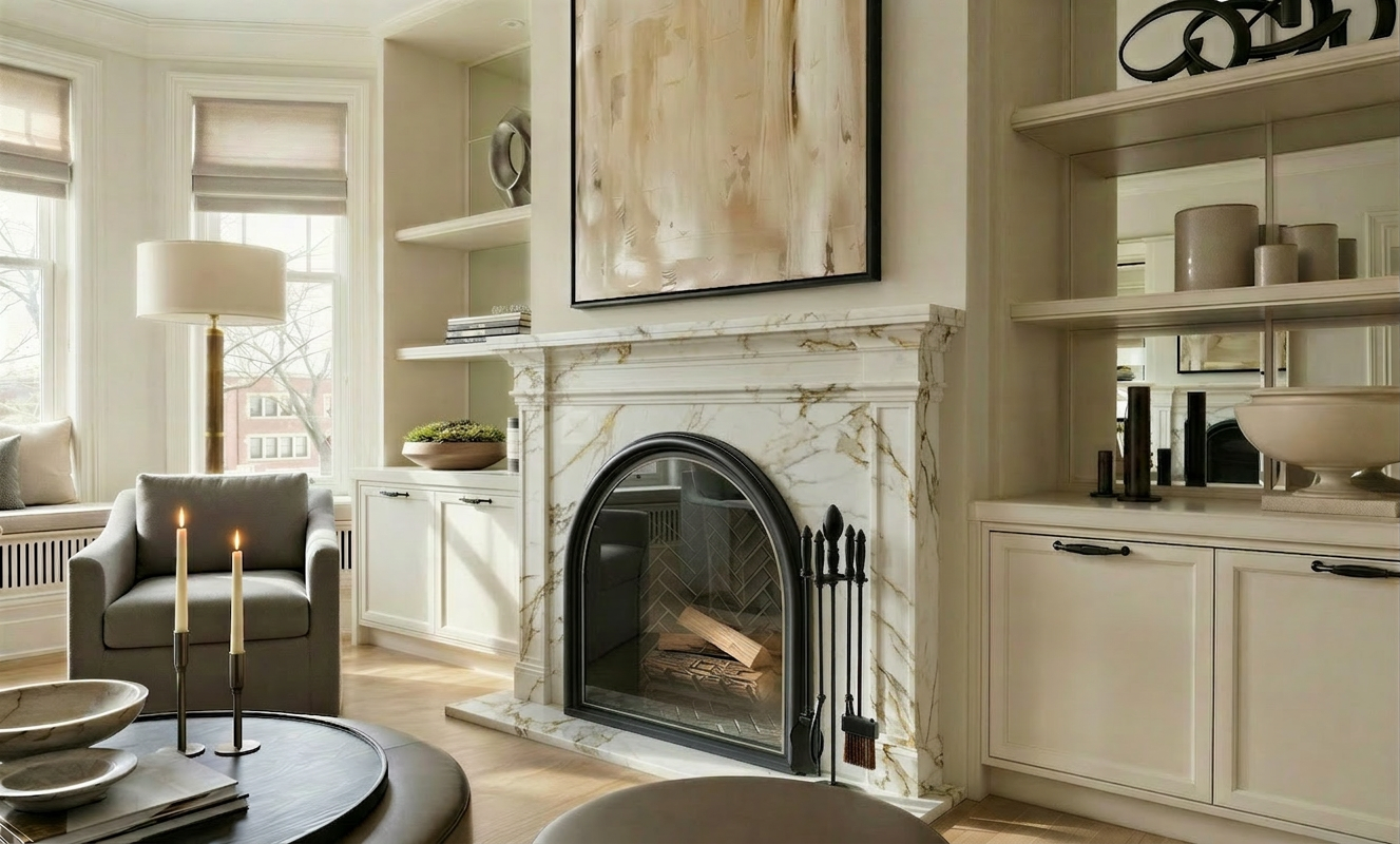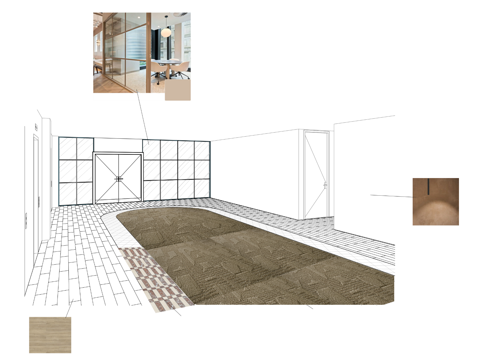 generate a realistic 3d view of a lobby using the reference materials used the image with the frame of the glass being powder coated beige