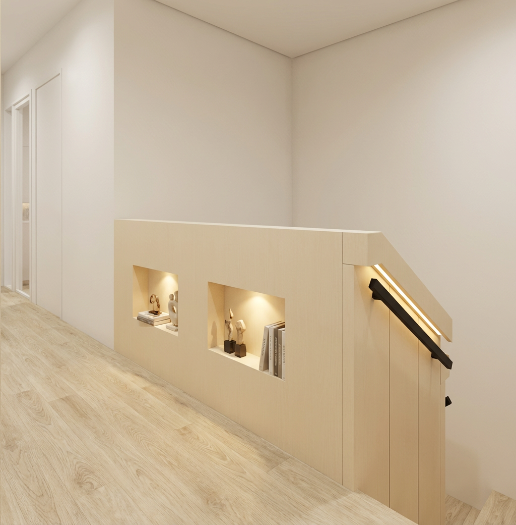 render senyata mungkin tambah indirect light di plafon dan headboard dan cove gorden warna panel tv kayu coklat lantai vinyl coklat terang ambien render off white terang kasunya buat jangan bolong kepotong ada bedframenya