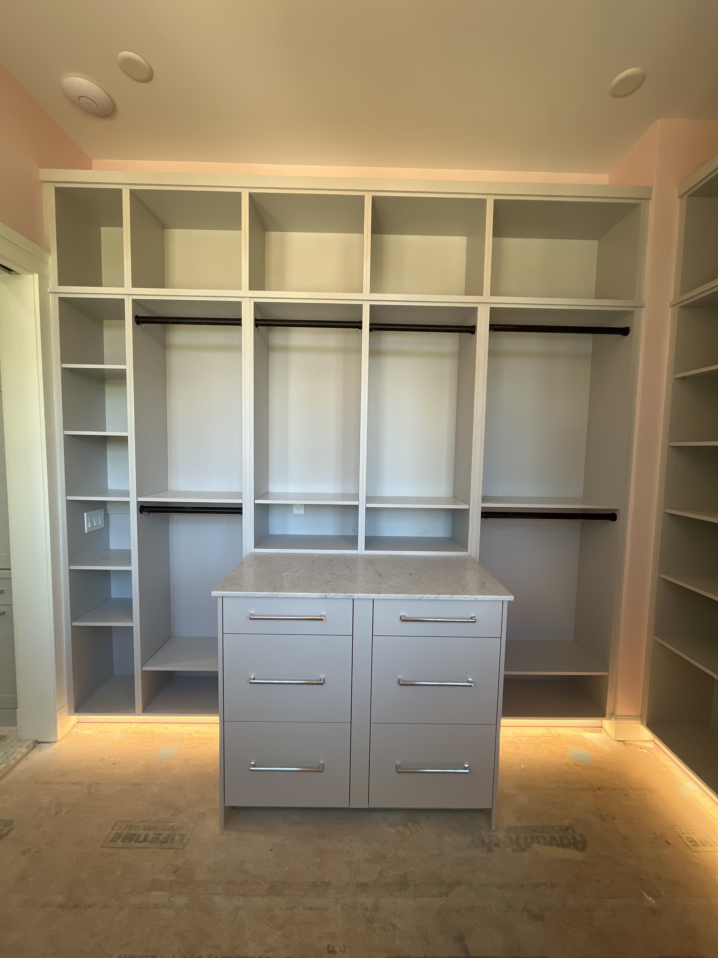 remove osb add carpet add lighting include clothes hanging on rods stage the shelves with shoes and purses include a chandelier hanging in the middle