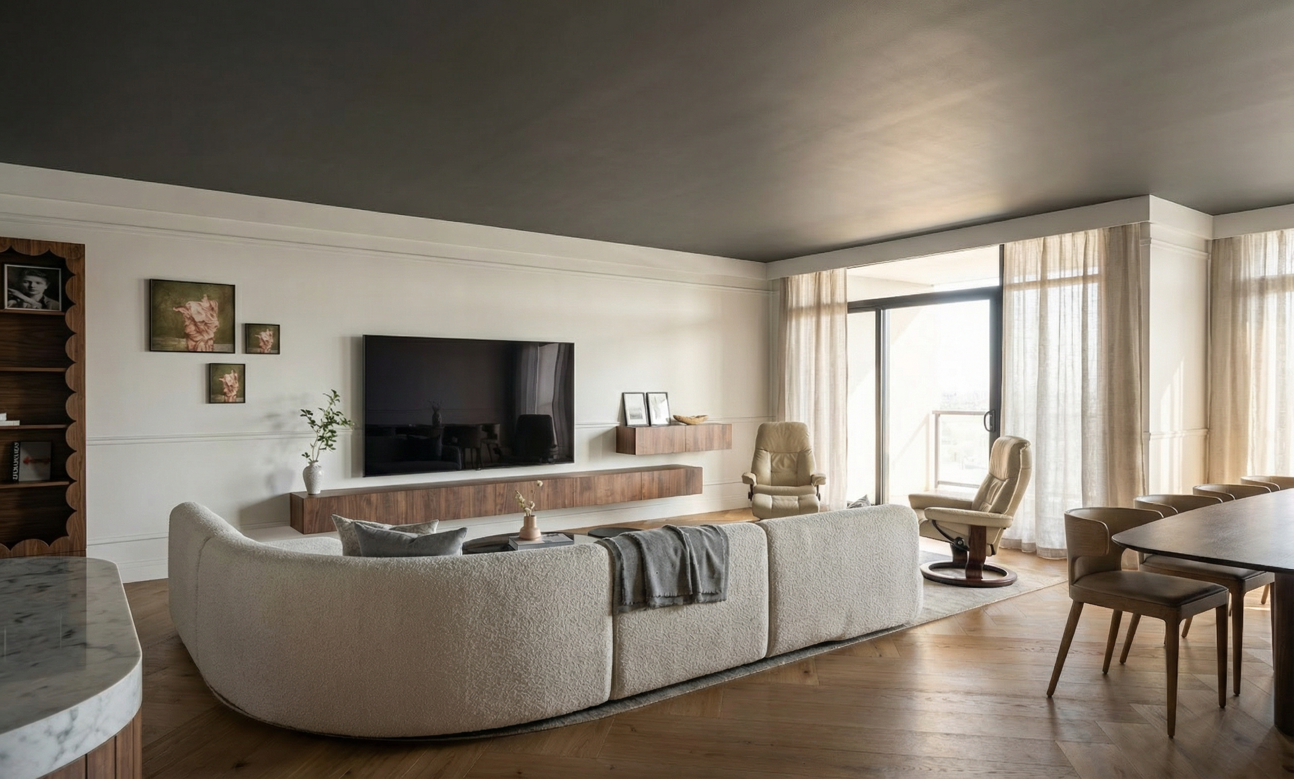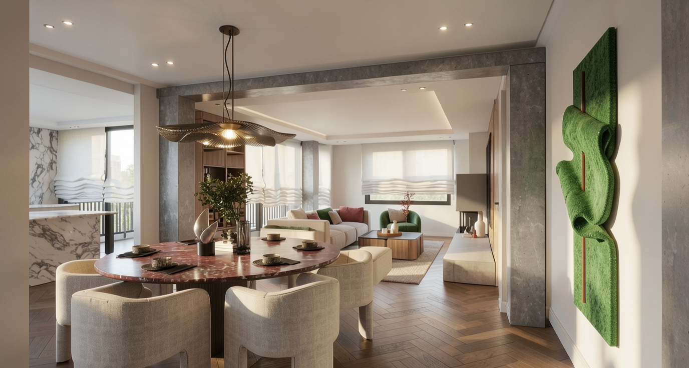 crea una imagen fotorealista a partir de este sketchup realza las texturas e iluminacion la escultura verde de la derecha es textura plastico duro