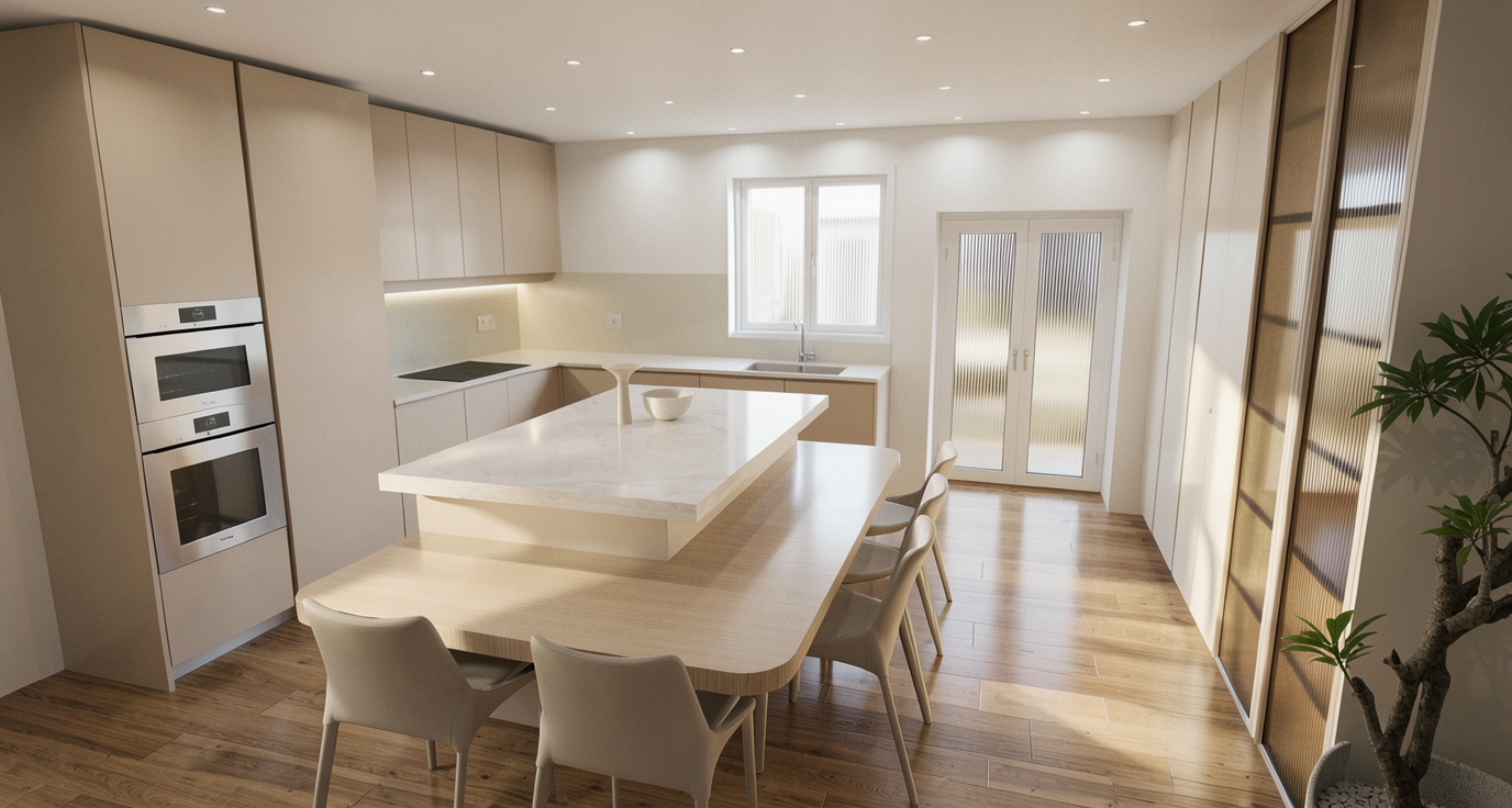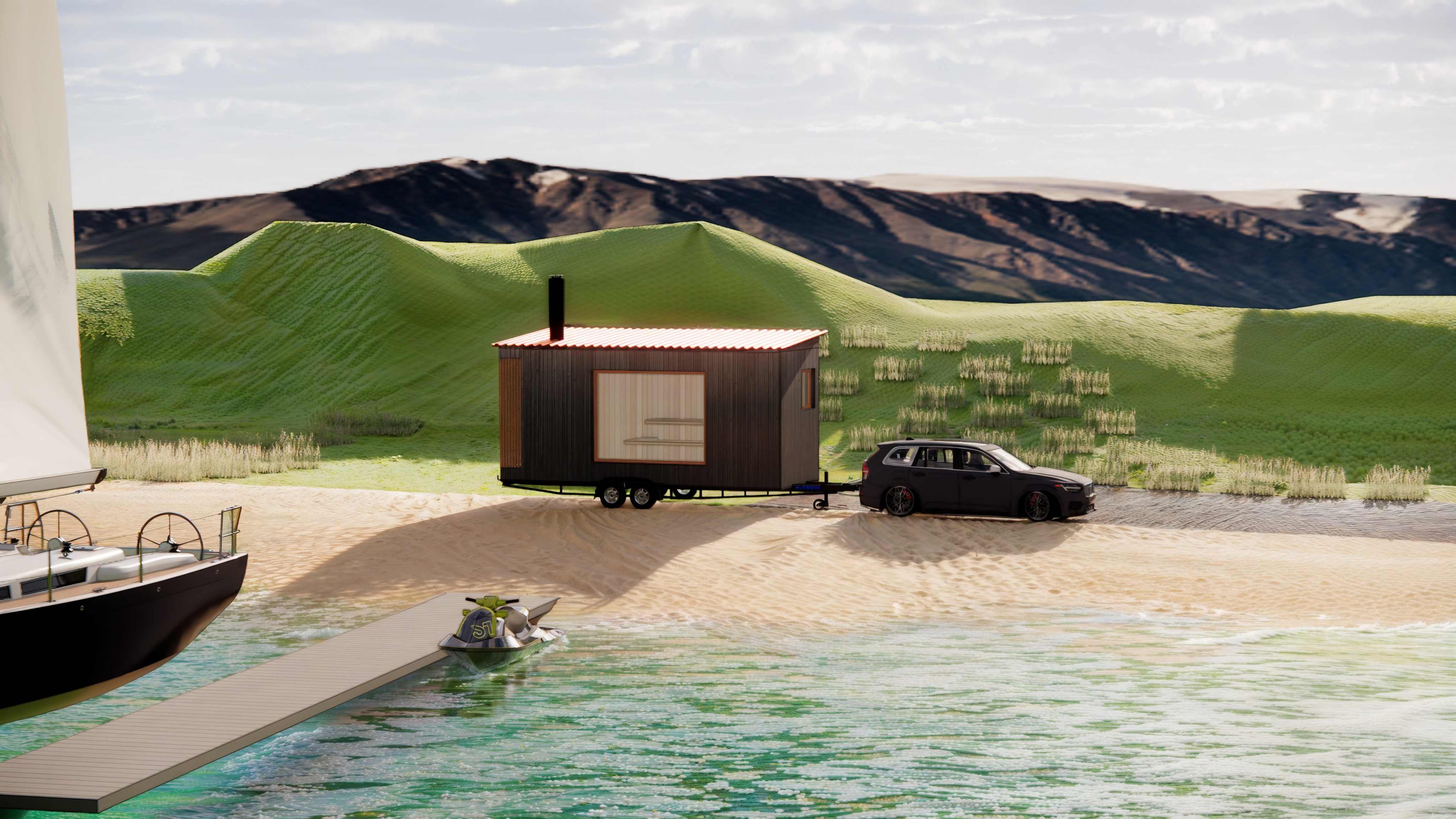 render a photorealistic 3d perspective of this sauna on trailer the current material style keep model geometry the same windows doors roof sky with light atmospheric depth render in hyper realistic architectural visualization quality 8k resolution