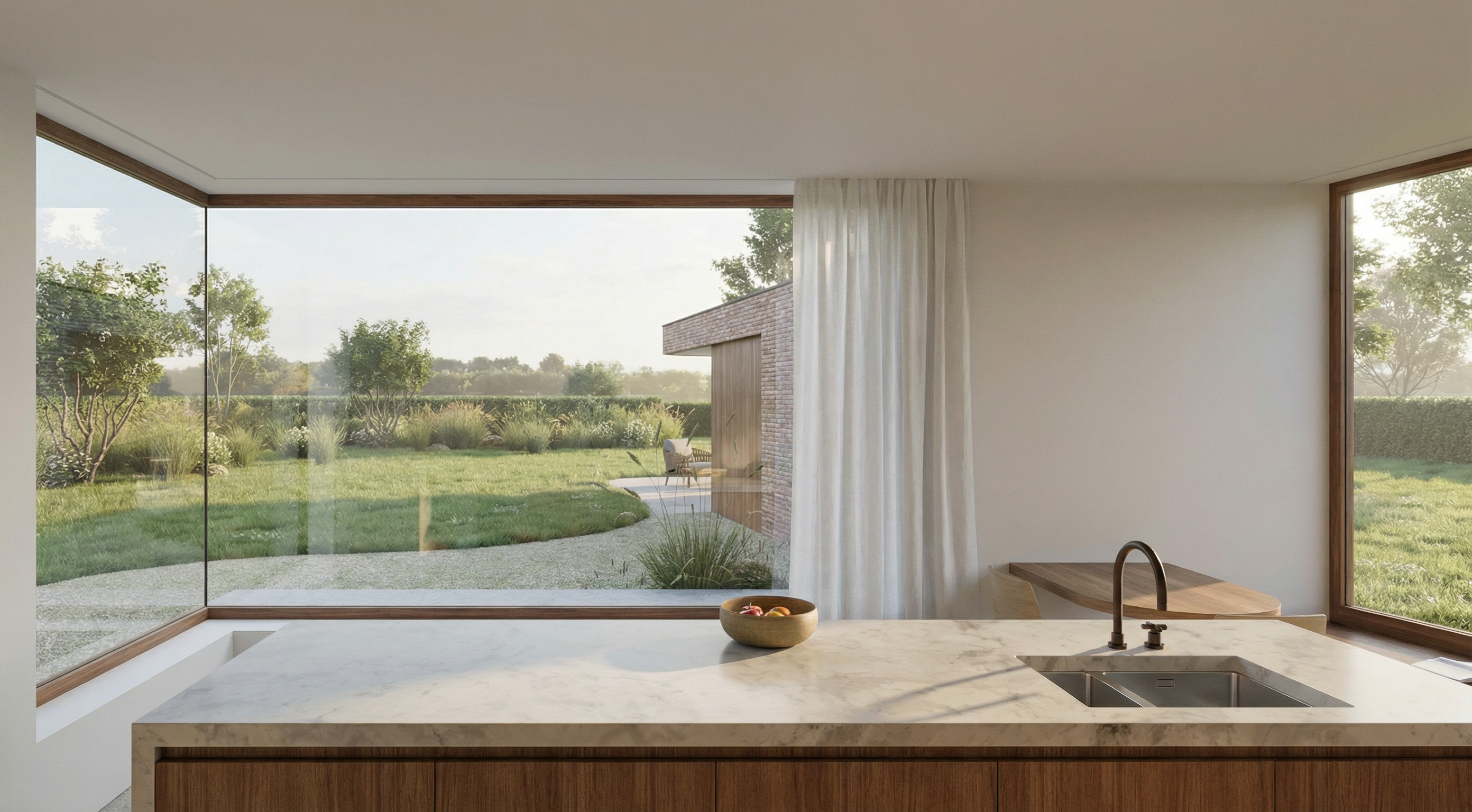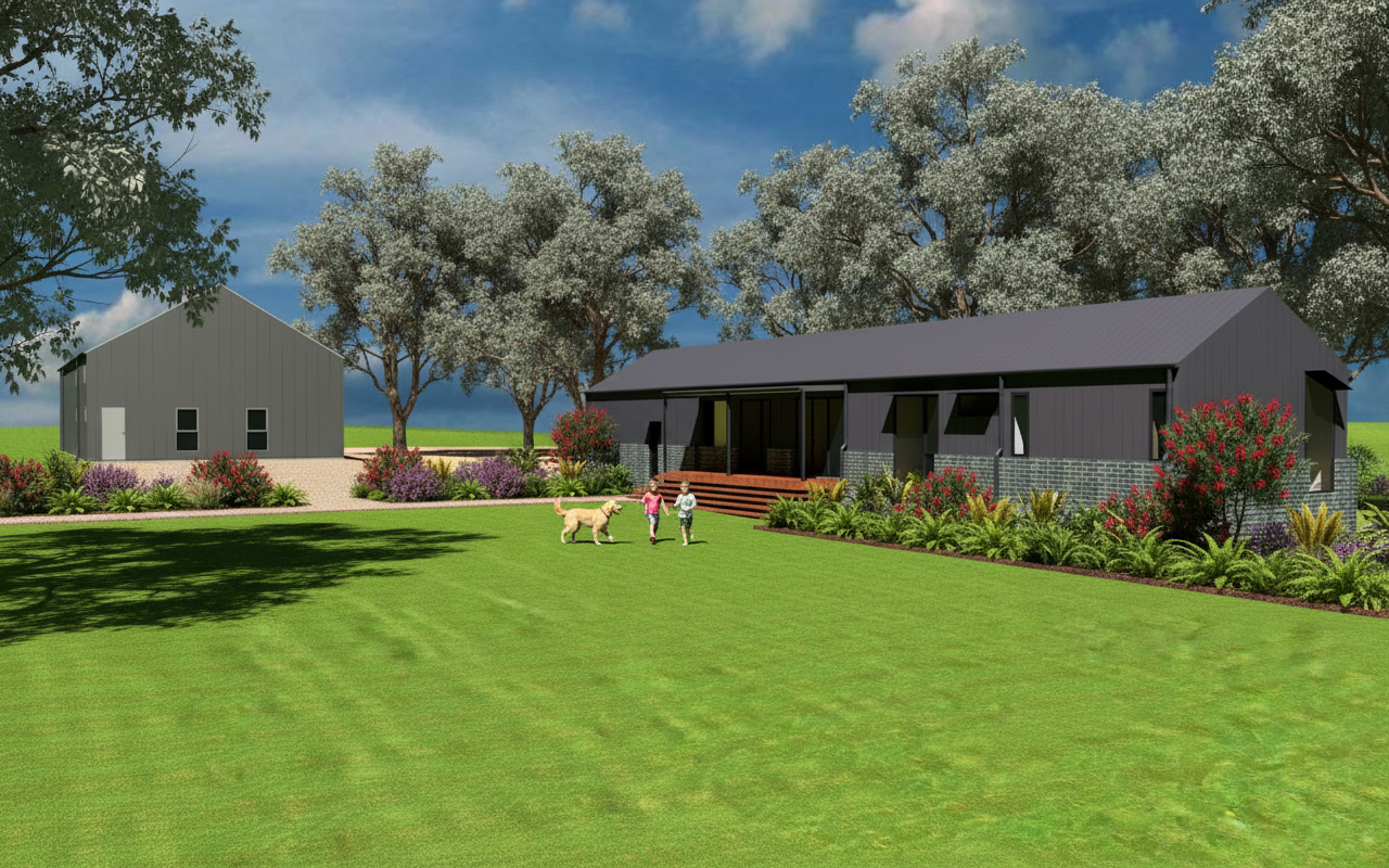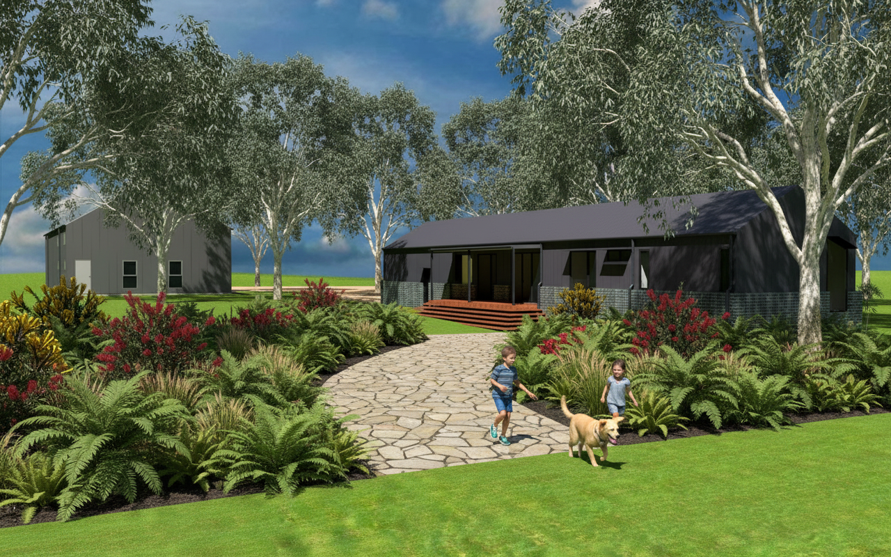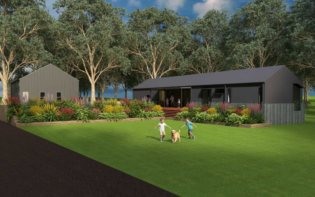 a manicured lawn layered plant beds low maintenance ferns native plants people australian large background eucalyptus trees australian foreground eucalyptus trees kids dog