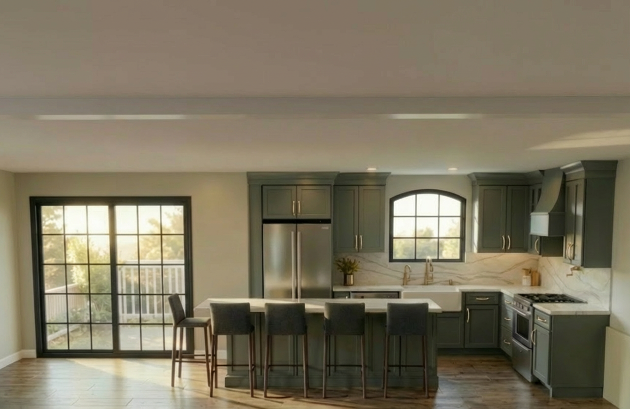 style modern farmhouse scene sunset exterior metal roofing white board and batt siding weathered wood accents
