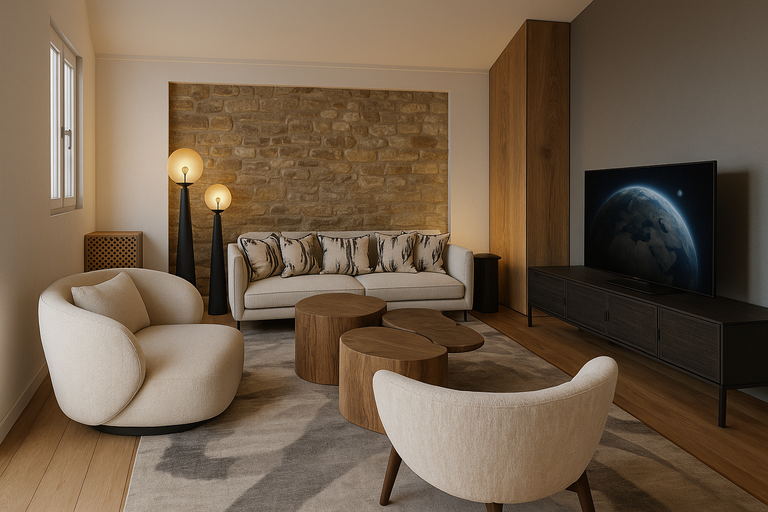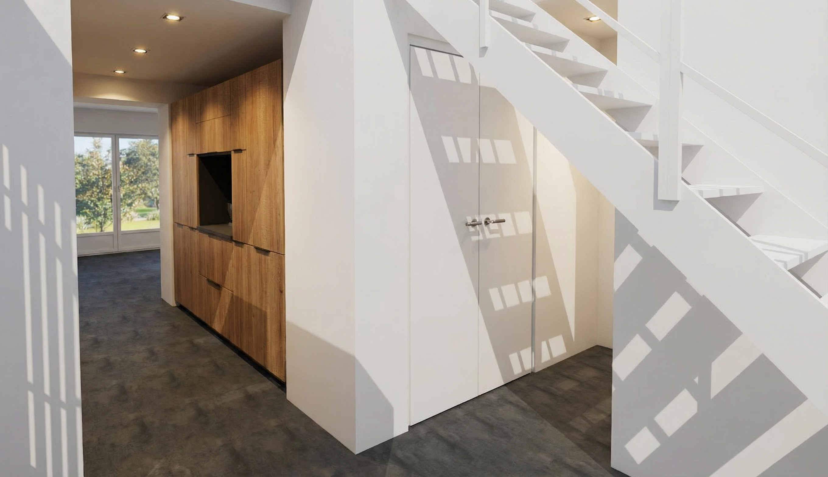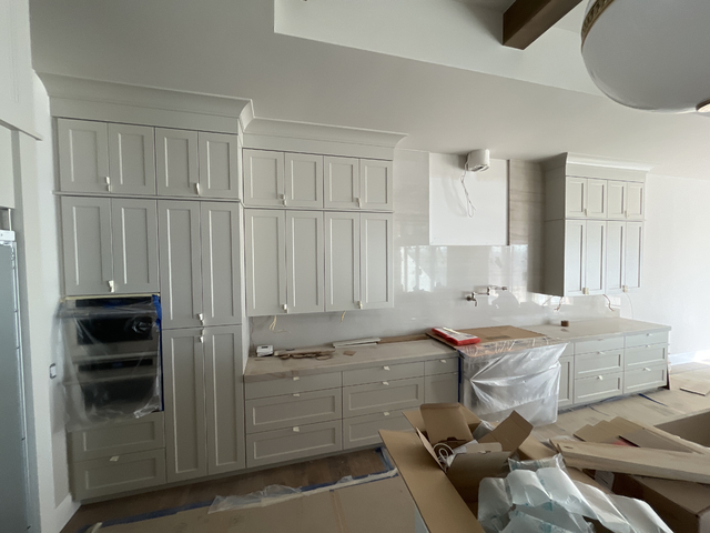 do not change the cabinets in any way preserve the exact cabinet colors materials finishes dimensions door and drawer styles hardware spacing alignment and all geometry exactly as shown do not alter the countertop shape backsplash appliances flooring lighting fixtures or wall structure only remove the construction materials clutter and mess from the scene clean the room and make it look finished and staged add a few simple tasteful home accessories appropriate for the style of the space but do not add or remove any furniture windows or architectural elements maintain the original lighting direction and realism enhance clarity and polish the photo while keeping the cabinetry and room design completely unchanged do not alter the lighting to keep the cabinet colors as they are in the image add a stainless hood between the upper cabinets remove the white tape on all of the cabinets add brushed nickel pulls to all of the cabinets